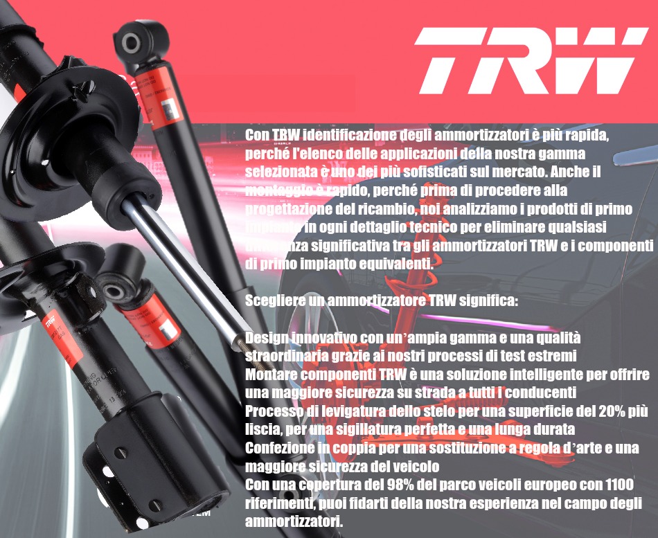 TRWTRW è il leader a livello globale nel settore delle soluzioni premium per freni, sterzo e sospensioni.Con oltre 100 anni di esperienza come fornitore di Primo Impianto (OE - Original Equipment), TRW detta gli standard di sicurezza e di qualità.