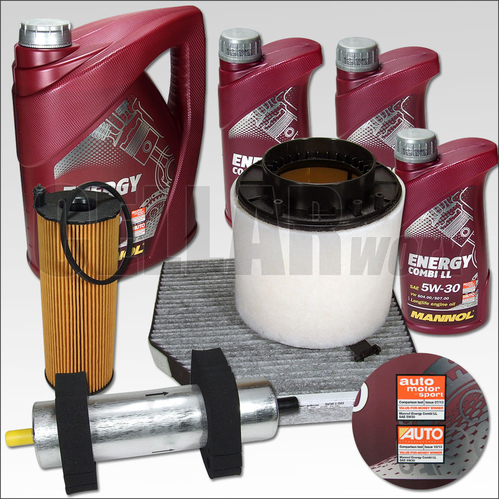 Inspektionskit mit Motoröl für Audi A4 8K 2.7 TDI & 3.0 TDI quattro 2.7 TDI 163/190 PS bis Fahrgestellnummer 8K_8A021989 3.0 TDI quattro 240 PS bis Fahrgestellnummer 8K_8N009060 Einschränkung betrifft nur die Ölfilterdichtung. OE-Nummer zu Vergleichszwecken: 057 115 561 L Gerne können Sie uns zwecks Kompatibilitätsprüfung vorab Ihre Fahrgestellnummer übermitteln Lieferumfang: Pollenfilter • Typ: Aktivkohlefilter • 100% passgenau • sehr hochwertig verarbeitet Motor-Luftfilter • 100% passgenau • sehr hochwertig verarbeitet Ölfilter inkl. Dichtung und Dichtring für Ölablassschraube • 100% passgenau • sehr hochwertig verarbeitet Dieselfilter / Kraftstofffilter 8 Liter MANNOL Energy Combi LL 5W-30 API SN/CF Motoröl Entspricht folgenden Freigaben / Spezifikationen / Produkten: SAE 5W-30 API SN/CF ACEA C3 BMW Longlife-04 MB 229.51 PORSCHE C30 VW 504.00/507.00/502.00/505.00/503.01/506.00/ VW 505.01*/506.01** MANNOL Energy Combi LL ist ein synthetisches Motoröl für moderne Benzin- und Turbodiesel-Motoren mit Pumpe-Düse. Es bietet eine hohe Pumpfähigkeit bei Kaltstarts. Verfügt über eine optimale Viskosität bei einem weiten Temperaturbereich. Effektiver Schutz vor Verschleiß und bietet eine außergewöhnliche Sauberkeit der Motorteile. Geeignet für Motoren mit oder ohne verlängertem Ölwechselintervall (Long Life). *Ausgenommen VW-PDU-Motoren ohne LongLife-Service (WIV) **Ausgenommen V10-PDU-Motoren im Phaeton bis Februar 2006 sowie R5-PDU-Motoren im Touareg bis Dezember 2006 Altölverordnung: Gemäß der Altölverordnung sind wir verpflichtet, folgende gebrauchte Öle kostenlos zurückzunehmen: -- Vebrennungsmotorenöle -- Getriebeöle -- Ölfilter und beim Ölwechsel regelmäßig anfallende ölhaltige Abfälle. Sie können das Altöl in der Menge bei uns zurückgeben, welche der bei uns gekauften Menge entspricht. Unsere Annahmestelle ist: CELLARworx Cornelia Frings Werderstr. 40 42655 Solingen Öffnungszeiten: Mo. - Fr. 10 - 17 Uhr Sie können die Öle dort jederzeit während der Öffnungszeiten abgeben. Alternativ können Sie das gebrauchte Öl auch an unsere Annahmestelle senden, wobei die Versandkosten hierbei von Ihnen zu tragen sind. Bitte beachten Sie, dass für Altöl besondere Transportbedingungen gelten können. Unsere Annahmestelle verfügt über einen Servicepartner, der es ermöglicht, den Ölwechsel fachgerecht durchzuführen. Falls Sie ein gewerblicher Endverbraucher sind, weisen wir darauf hin, dass wir uns Ihnen gegenüber zur Erfüllung unserer Annahmepflichten Dritter bedienen können.