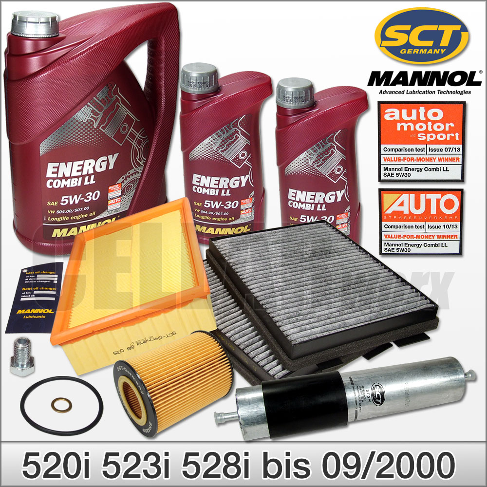 Inspektionskit mit Motoröl für BMW 5er E39 Benziner 6-Zylinder bis Bj. 09/2000 Lieferumfang: Pollenfilter (SCT-Germany) • 2 Filter im Originalkarton • Typ: Aktivkohlefilter • 100% passgenau • stabiler Kunststoffrahmen mit Schaumstoffdichtung Motor-Luftfilter (SCT-Germany) • 100% passgenau • sehr hochwertig verarbeitet Ölfilter inkl. Dichtung und Ölablassschraube (SCT-Germany) • 100% passgenau • sehr hochwertig verarbeitet Benzinfilter / Kraftstofffilter (SCT-Germany) • 100% passgenau • sehr hochwertig verarbeitet 7 Liter MANNOL Energy Combi LL 5W-30 API SN/CF Motoröl Entspricht folgenden Freigaben / Spezifikationen / Produkten: SAE 5W-30 API SN/CF ACEA C3 BMW Longlife-04 MB 229.51 PORSCHE C30 VW 504.00/507.00/502.00/505.00/503.01/506.00/ VW 505.01*/506.01** MANNOL Energy Combi LL ist ein synthetisches Motoröl für moderne Benzin- und Turbodiesel-Motoren mit Pumpe-Düse. Es bietet eine hohe Pumpfähigkeit bei Kaltstarts. Verfügt über eine optimale Viskosität bei einem weiten Temperaturbereich. Effektiver Schutz vor Verschleiß und bietet eine außergewöhnliche Sauberkeit der Motorteile. Geeignet für Motoren mit oder ohne verlängertem Ölwechselintervall (Long Life). *Ausgenommen VW-PDU-Motoren ohne LongLife-Service (WIV) **Ausgenommen V10-PDU-Motoren im Phaeton bis Februar 2006 sowie R5-PDU-Motoren im Touareg bis Dezember 2006 Altölverordnung: Gemäß der Altölverordnung sind wir verpflichtet, folgende gebrauchte Öle kostenlos zurückzunehmen: -- Vebrennungsmotorenöle -- Getriebeöle -- Ölfilter und beim Ölwechsel regelmäßig anfallende ölhaltige Abfälle. Sie können das Altöl in der Menge bei uns zurückgeben, welche der bei uns gekauften Menge entspricht. Unsere Annahmestelle ist: CELLARworx Cornelia Frings Werderstr. 40 42655 Solingen Öffnungszeiten: Mo. - Fr. 10 - 17 Uhr Sie können die Öle dort jederzeit während der Öffnungszeiten abgeben. Alternativ können Sie das gebrauchte Öl auch an unsere Annahmestelle senden, wobei die Versandkosten hierbei von Ihnen zu tragen sind. Bitte beachten Sie, dass für Altöl besondere Transportbedingungen gelten können. Unsere Annahmestelle verfügt über einen Servicepartner, der es ermöglicht, den Ölwechsel fachgerecht durchzuführen. Falls Sie ein gewerblicher Endverbraucher sind, weisen wir darauf hin, dass wir uns Ihnen gegenüber zur Erfüllung unserer Annahmepflichten Dritter bedienen können.