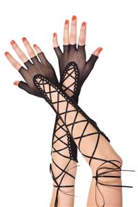 - Description: Elbow length, lace-up fingerless costume gloves.