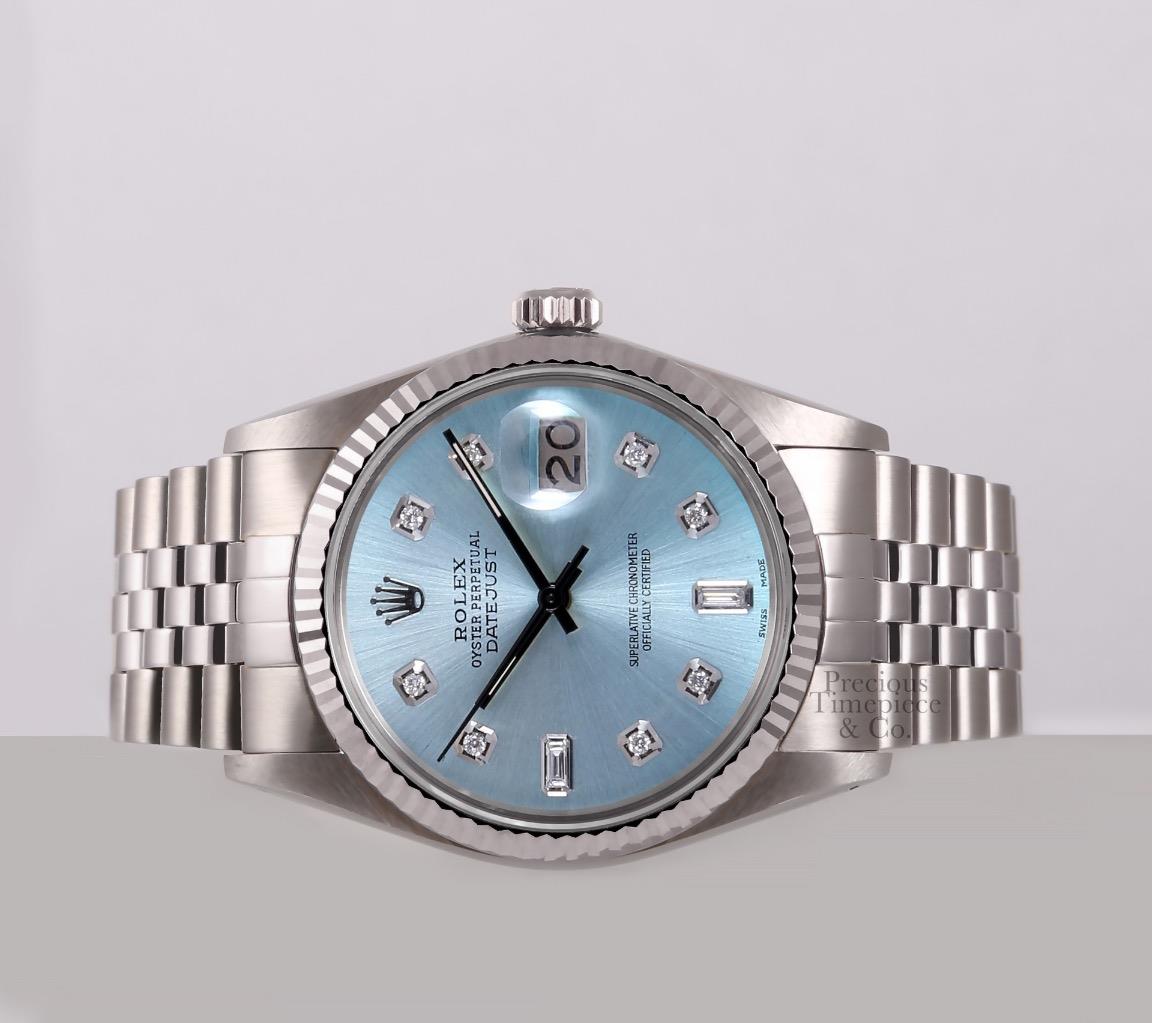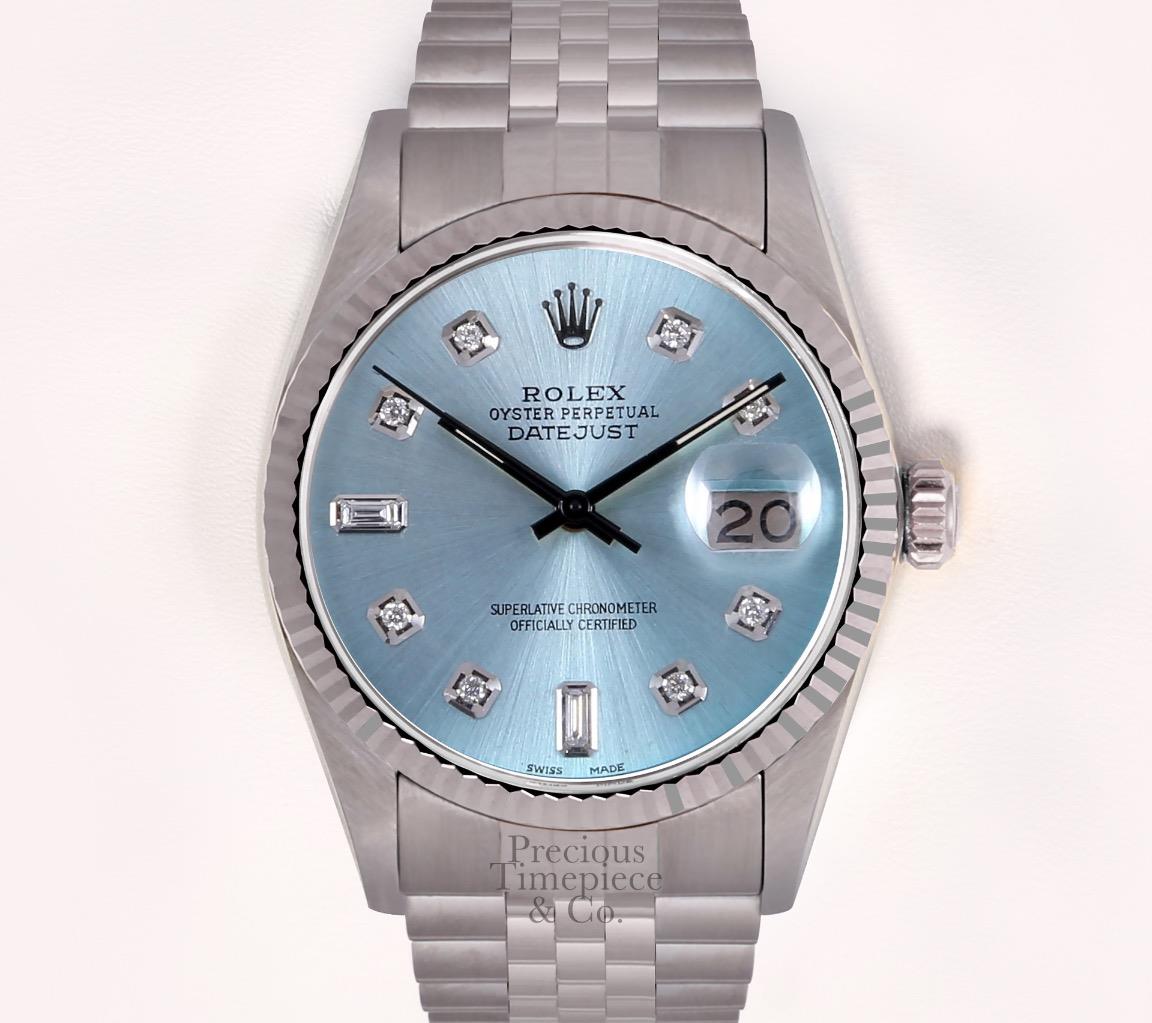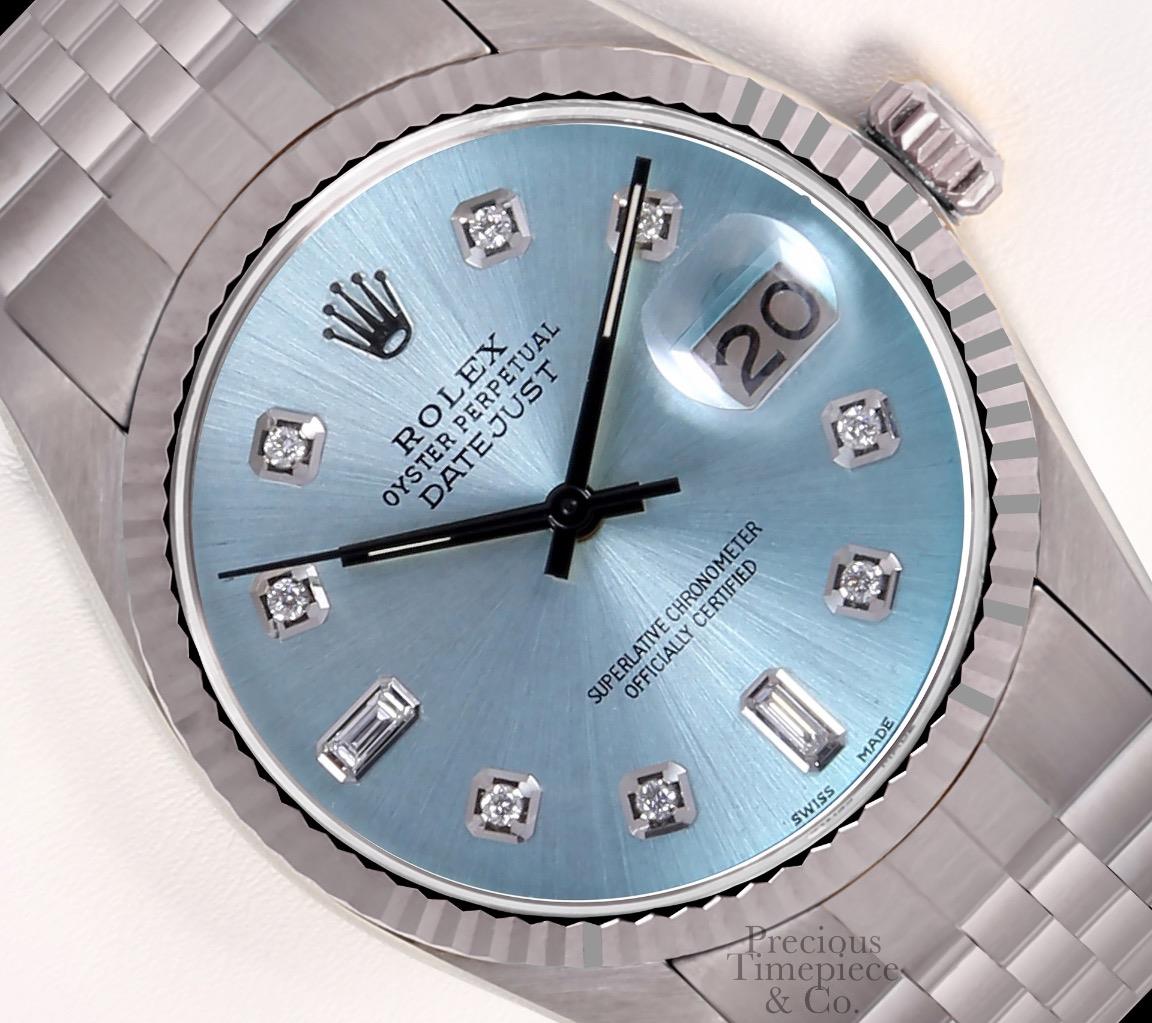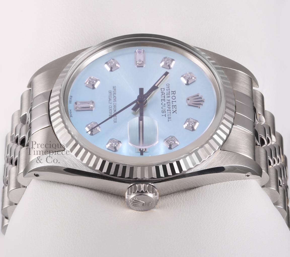 | DIAL | Custom Ice Blue Dial with 8 Full Cut Diamonds and 2 Sapphire Baguette Diamonds |