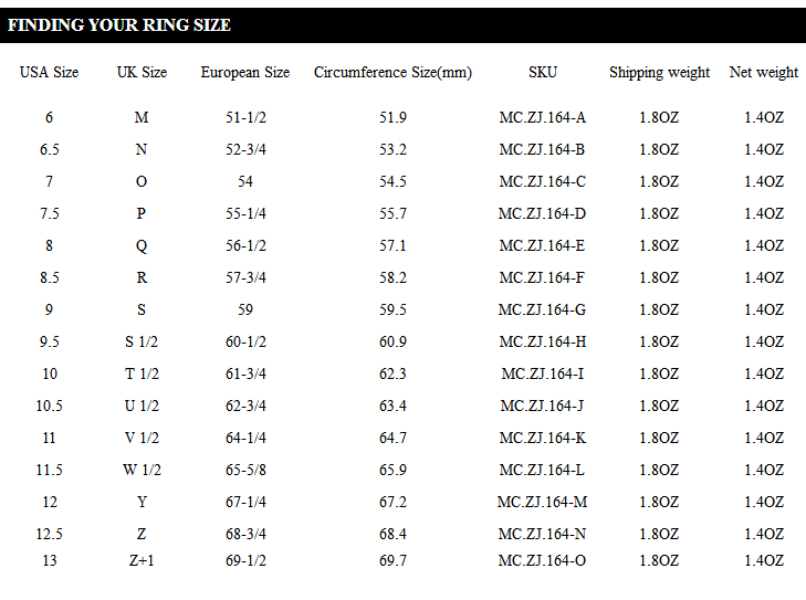 5.Locate the ring size by locating your measuring on the printed chart.If the measurement falls in between two size, it is recommended that you chose the large size.