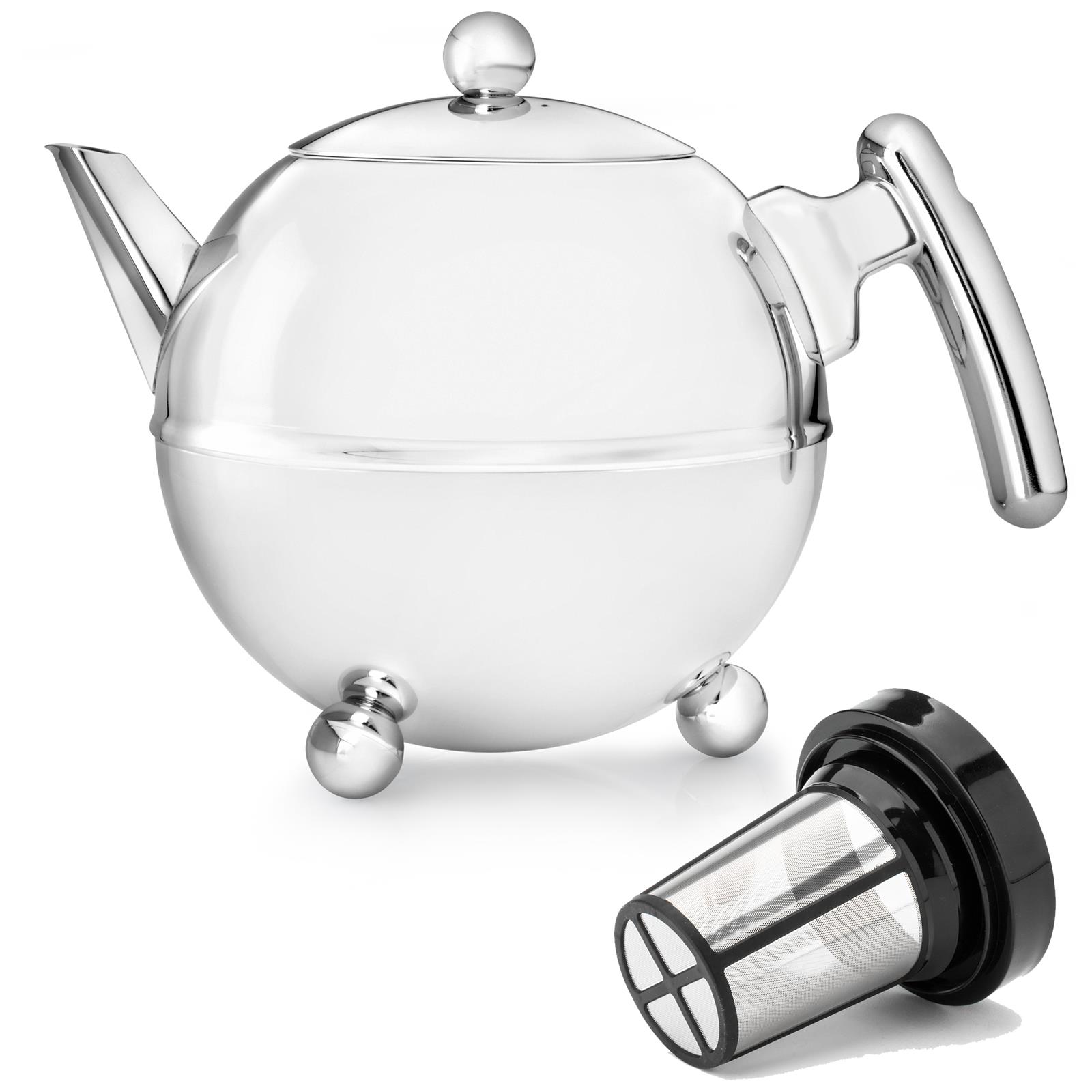 Der Vorteil dieses doppelwandigen chromfarbenen Edelstahlteekannen Sets ist seine isolierende Eigenschaft. Dank der doppelten Wand der praktischen breiten Teekanne mit 1.2 Liter Fassungsvermögen bleibt Ihr Tee, je nach Füllungsgrad, bis zu einer Stunde warm und geschmackvoll. Die funktionelle Kanne für Tee sorgt für einen idealen Temperaturverlauf und hält auch danach Ihr Heißgetränk langanhaltend warm! Durch den komfortablen Griff der außergewöhnlichen molligen Teekanne lässt sie sich auch befüllt gut handhaben. Der gutsitzende Teekannen-Deckel bleibt beim Eingießen auf der kugelrunden modernen Teekanne - selbst wenn Sie das in dem Tee-Set enthaltene feine Teesieb nutzen. Über Teekannenflecken brauchen Sie sich bei der hellen kugeligen Teekanne nicht zu sorgen, denn diese isolierende Teekanne mit Deckel verfügt über drei stabile Kunststoff-Füße. Das langlebige Filter-Sieb erleichtert zudem Ihre Teezubereitung enorm. Das feinporige Teesieb aus Kunststoff und Edelstahl bietet neben der Nachhaltigkeit auch ein optimales Aroma des Tees: Ganze Teeblätter haben genug Platz, um ihren Geschmack voll entfalten zu können und klein gemahlene Teeblätter bleiben in dem feingliedrigen Teesieb dieser Kugelkanne. Dazu bezaubert das optisch glänzende und edle Design der stilvollen Edelstahl-Teekanne jeden Teeliebhaber.