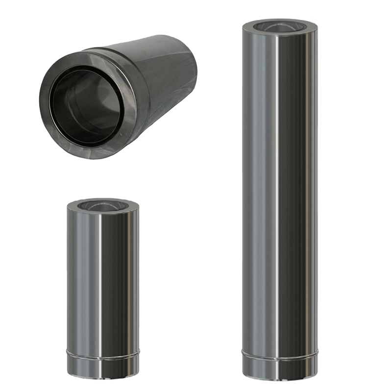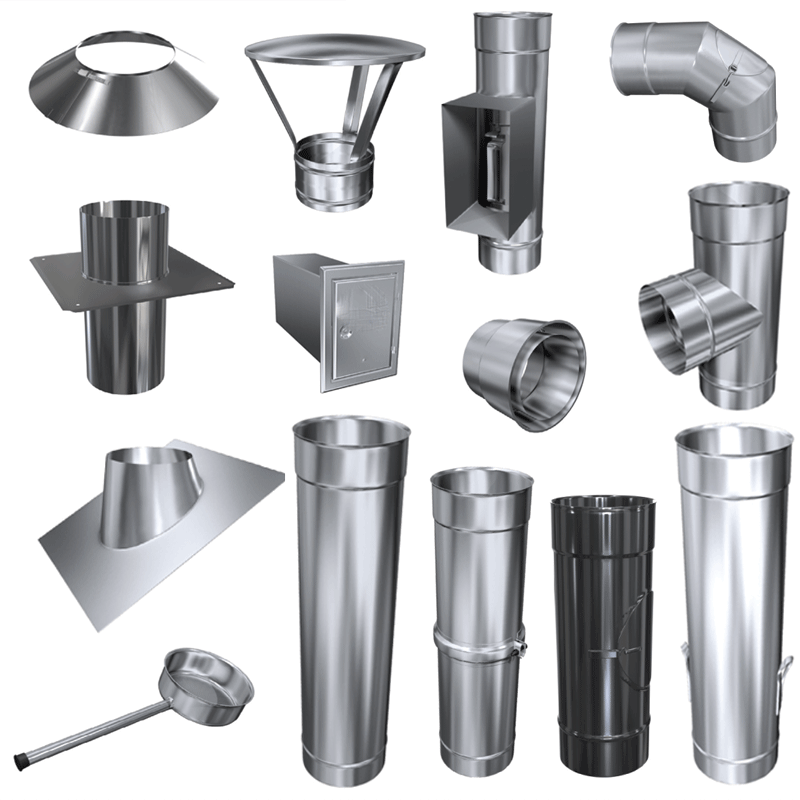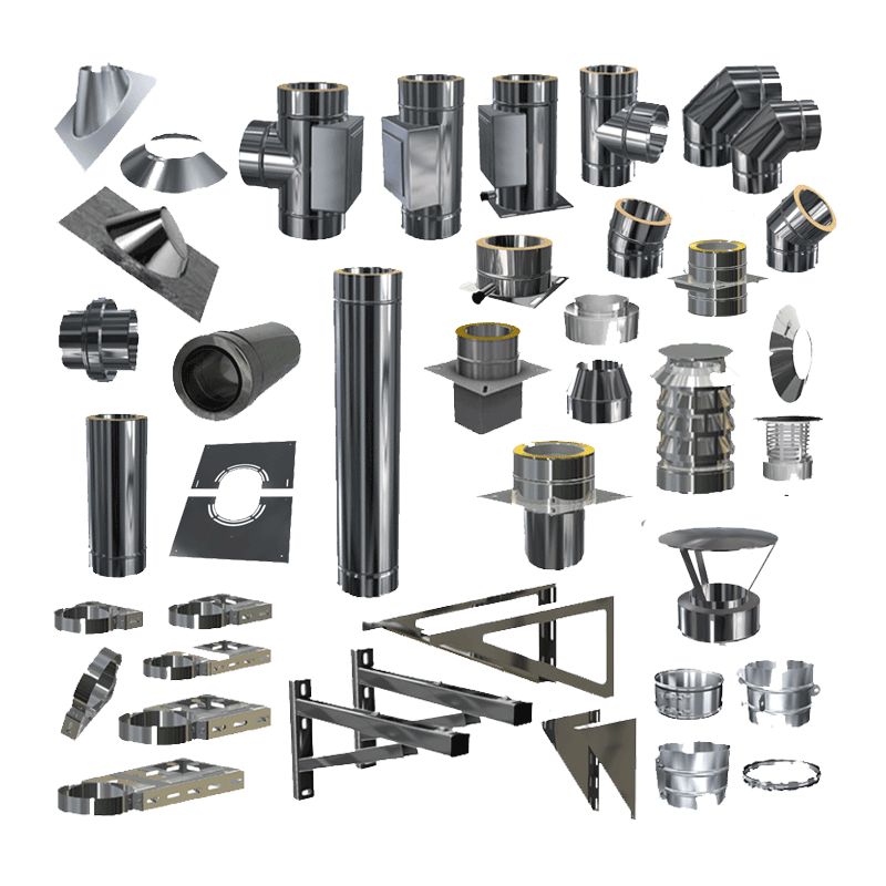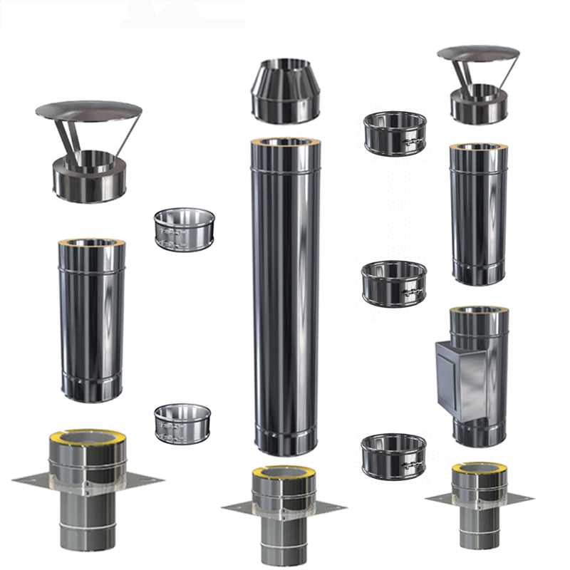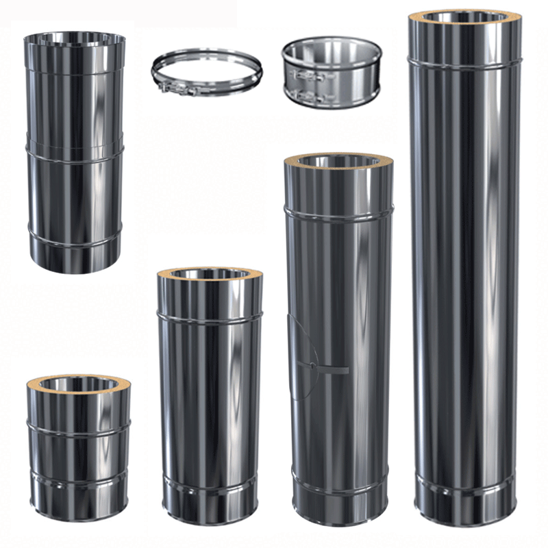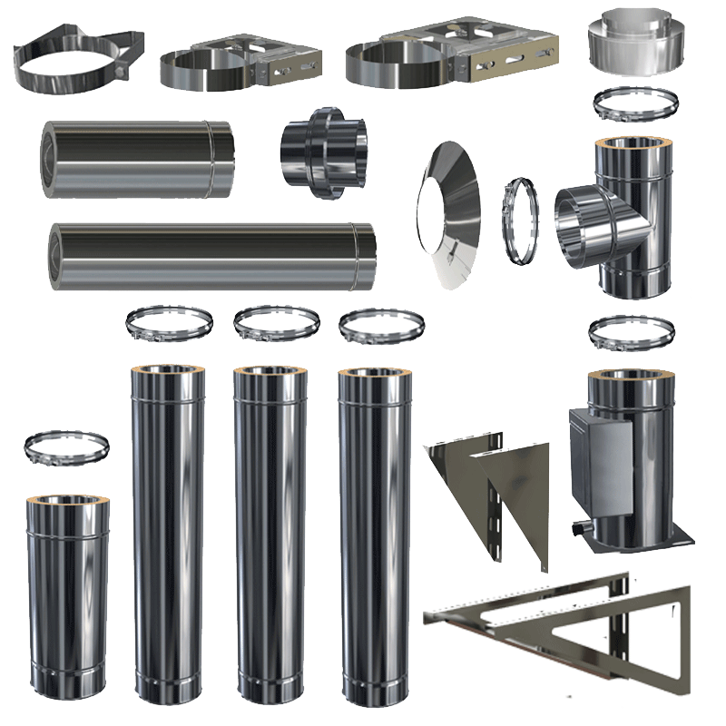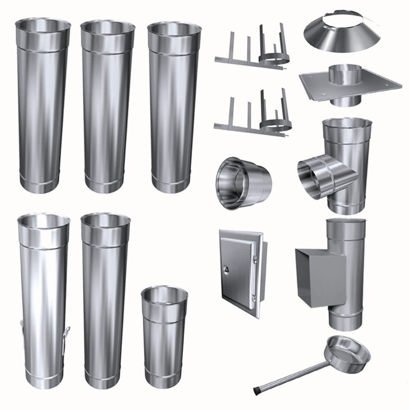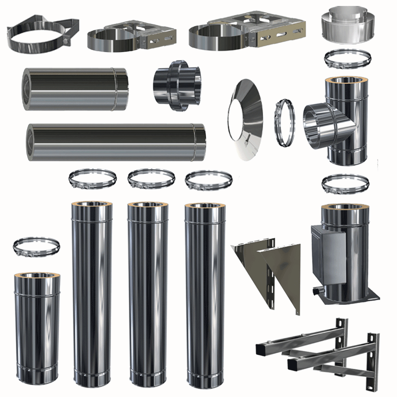 Doppelwandige Edelstahlschornstein Zubehör Einzelbauteile. In den Durchmessern 80 mm - 200 mm und der Materialstärke 0,5 mm wählbar. Siehe unten technische Daten der Materialstärke.