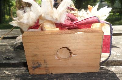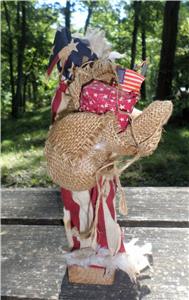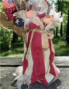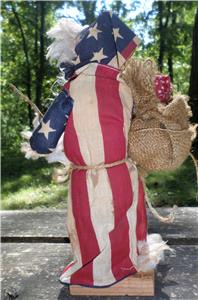 I do not know the age of this shabby Patriotic Santa but do think he is pretty sweet despite of his old condition. Please notice the cotton edging that is around his hat, end of sleeves and around the bottom of his outfit. The cotton is missing from one side of the bottom of his outfit. The cotton ball like trim also looks dirty and tattered. There are some stains on his outfit that could be tea stains. Which really makes me question if the stains are real or put there intentionally to give one the feeling that this Santa may have been a Soldier Santa? He is carrying the American Flag in his bag. Sticks for a handy campfire! His face and hands are either a soft plastic or may possibly be rubber. I like his shabby look! He has the fat cheeks, one could pinch, blue eyes that sparkle and a cute pug nose!