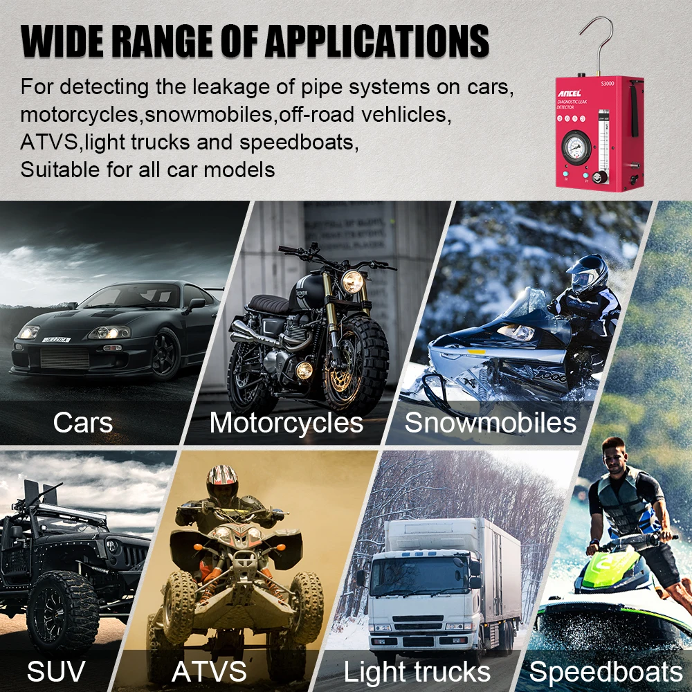 ANCEL S3000 is a professional auto pipe leak detect tool. It will help us position cars motorcycles leakage on pipe system quickly and exactly ,such as : Intake System Test, Exhaust Systems Test, Car Sealing Test, Fuel Tank System Test.