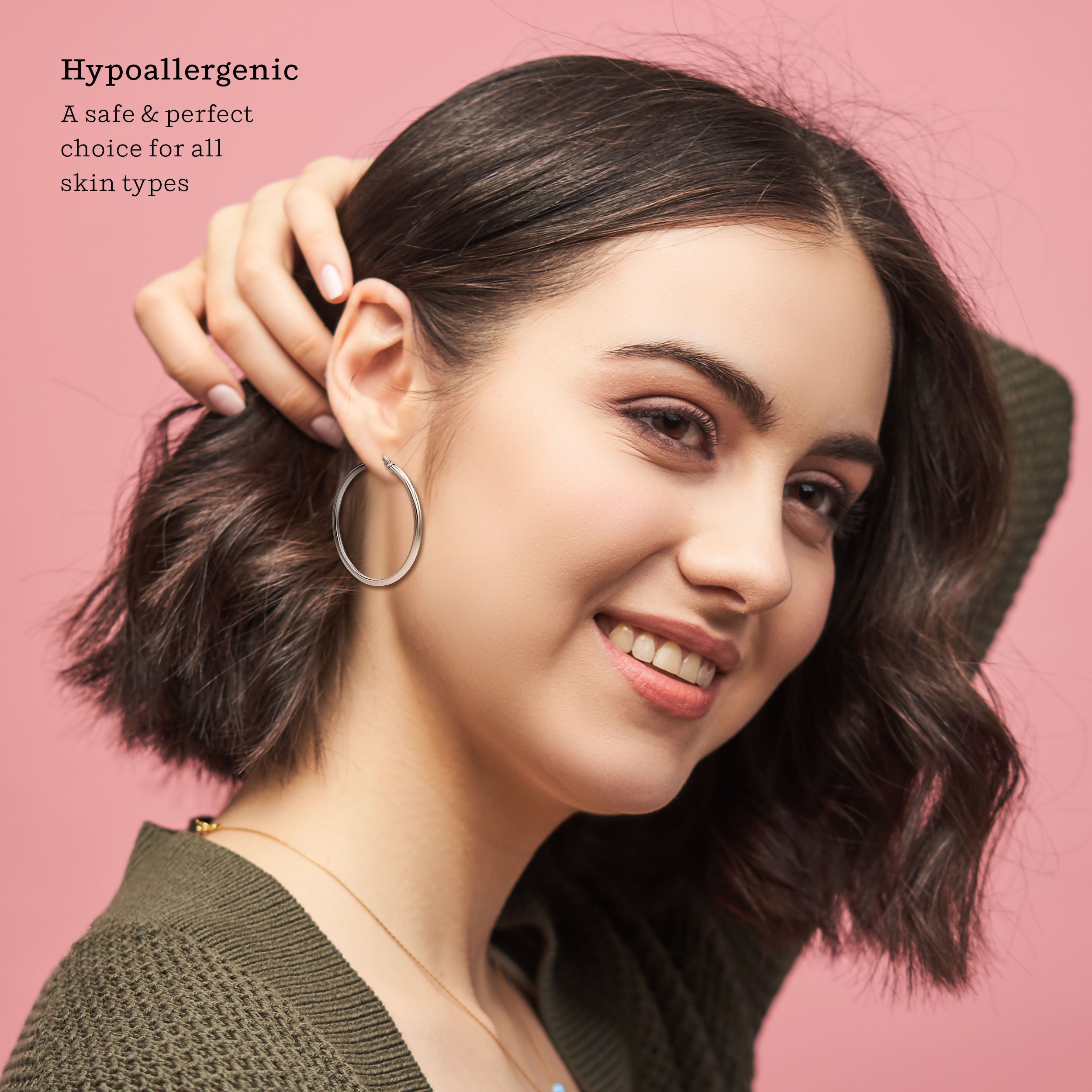 Our hypoallergenic silver hoops are perfect for those with sensitive skin, ensuring comfort and elegance that lasts all day. The lightweight tube construction and secure click-top closure provide both comfort and peace of mind, knowing your earrings are safely in place. With our commitment to quality, these earrings are proudly made in the USA, showcasing exceptional craftsmanship in every detail.