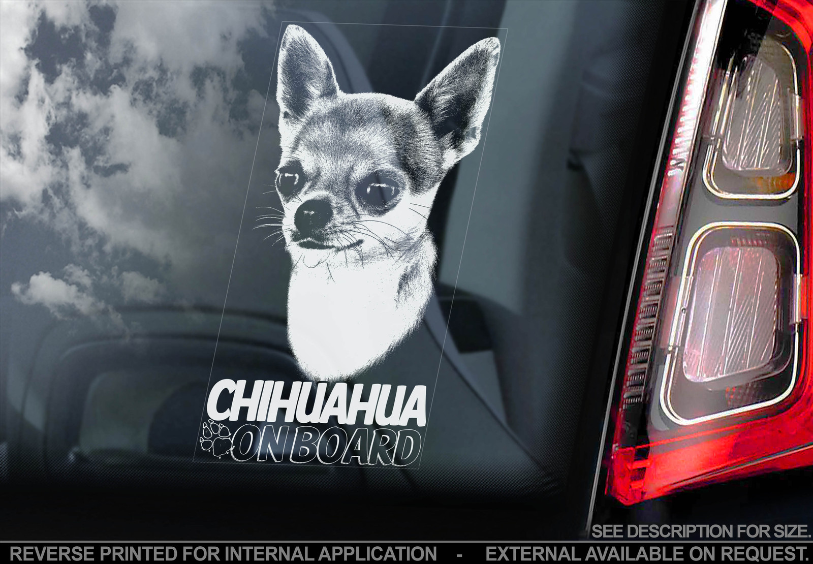 CHIHUAHUA High Detail INTERNAL Car Sticker REVERSE printed, allowing for application to the inside of the window, protecting it from dirt NOTE: If required, stickers can be produced for external application (eg: Toolbox/heavy tint windows), please leave a note during the checkout if you would like your item produced this way. _____________________________________________________________________________________ Size : 205 x 100mm > White graphic embedded within a panel of clear vinyl > All orders shipped within 48-hrs of payment clearance > All orders sent safely packaged within a rigid-board mailer > Application instructions supplied > Ideal size ensures rearward vision is not impared _____________________________________________________________________________________ Custom Designs possible, just ask! Check out our other designs! Be sure to add StudioSticker to your favourites list! _____________________________________________________________________________________ Shipping See tab at top of the listing 'POSTAGE & PAYMENTS' / 'SHIPPING & PAYMENTS' - for full shipping details & discount rates for multiple items IMPORTANT: Your order will be sent to the address you specify on your Paypal payment.