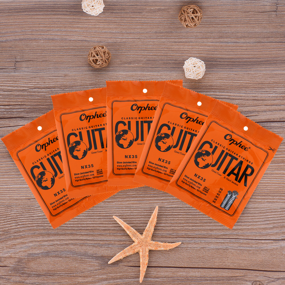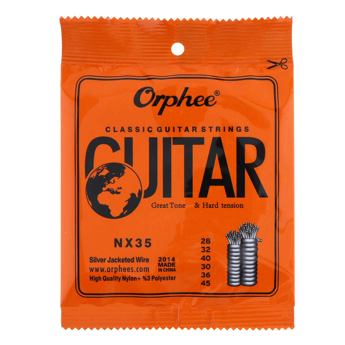 ITEM DESCRIPTIONFeatures:Perfect string replacement suitable for classical guitar.With good playing feeling, hard tension, profound and mellow tone. 6pcs in 1 package, E-1st, B-2nd, G-3rd, D-4th, A-5th, E-6th. The 1st, 2nd and 3rd strings are adopt high quality nylon, with long service life. The 4th, 5th and 6th strings are made of high quality nylon core plated with silver wound, with high glossiness appearance. It is best choice for primary guitar players and professional performance. Specifications:Brand: OrpheeModel: NX35 Tension: Hard Material(1st, 2nd and 3rd strings): High-quality Nylon Material(4th, 5th and 6th strings): High-quality Nylon(Inside) / Silver Jacketed Wire(Outside) Packing: Plastic Bag Note/inch/mm: E/028/0.71; B/032/0.81; G/040/1.02; D/030/0.76; A/036/0.91; E/045/1.14 Package Size: 11 * 14 * 1.5cm / 4.3 * 5.7 * 0.5in Package Weight: 95g / 3.4oz Package List:5 * Set of Classical Guitar StringsNote:The guitar is not included.You may also likeITEM DESCRIPTION1. We only accept Papal payment.
