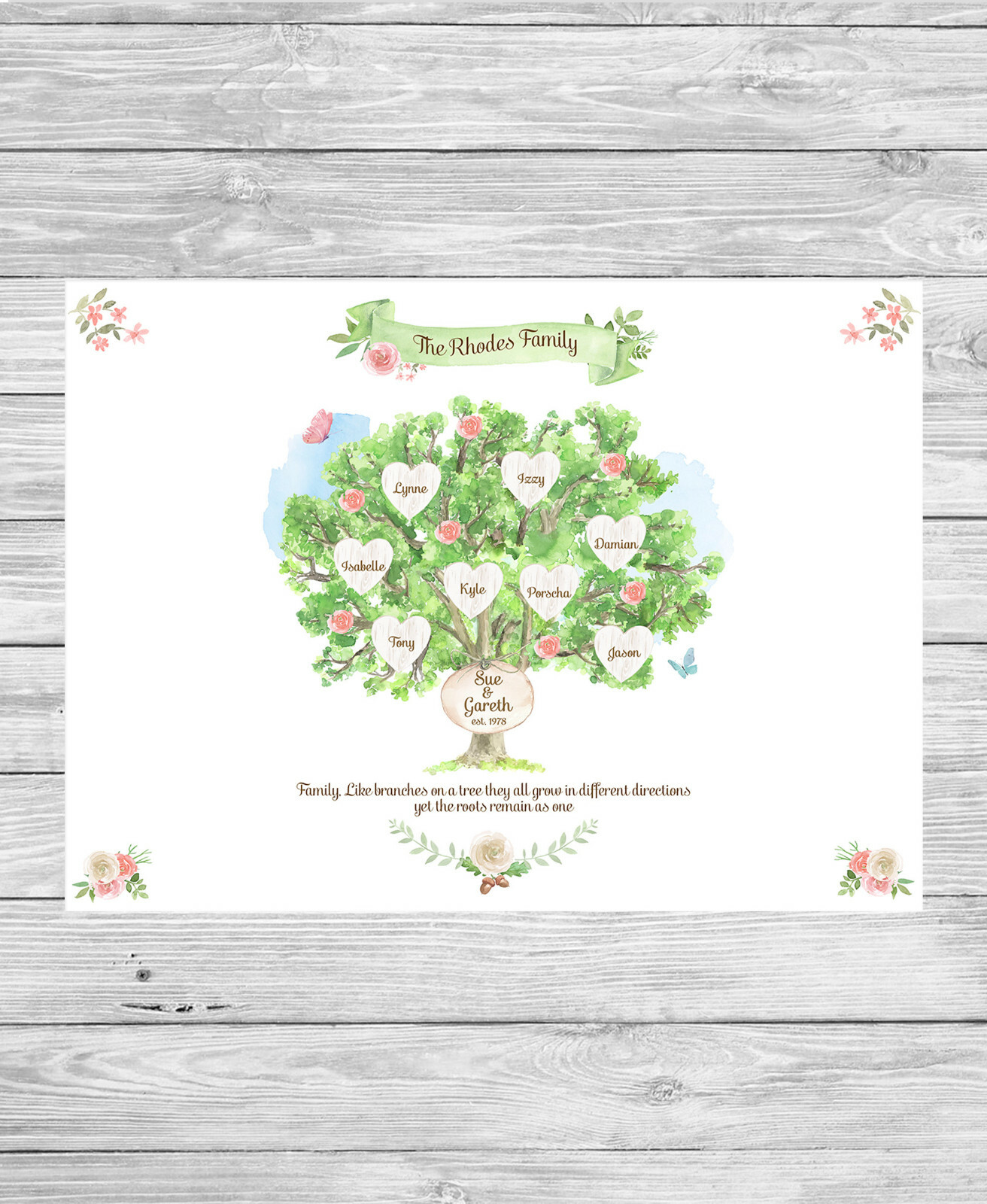 - The Names to appear in each heart of the tree. We can remove or add hearts to a maximum of 12 in total. If you would like children in smaller hearts than the adults this MUST be specified when ordering as cannot later be altered. You will also need to mention which of the names are children.