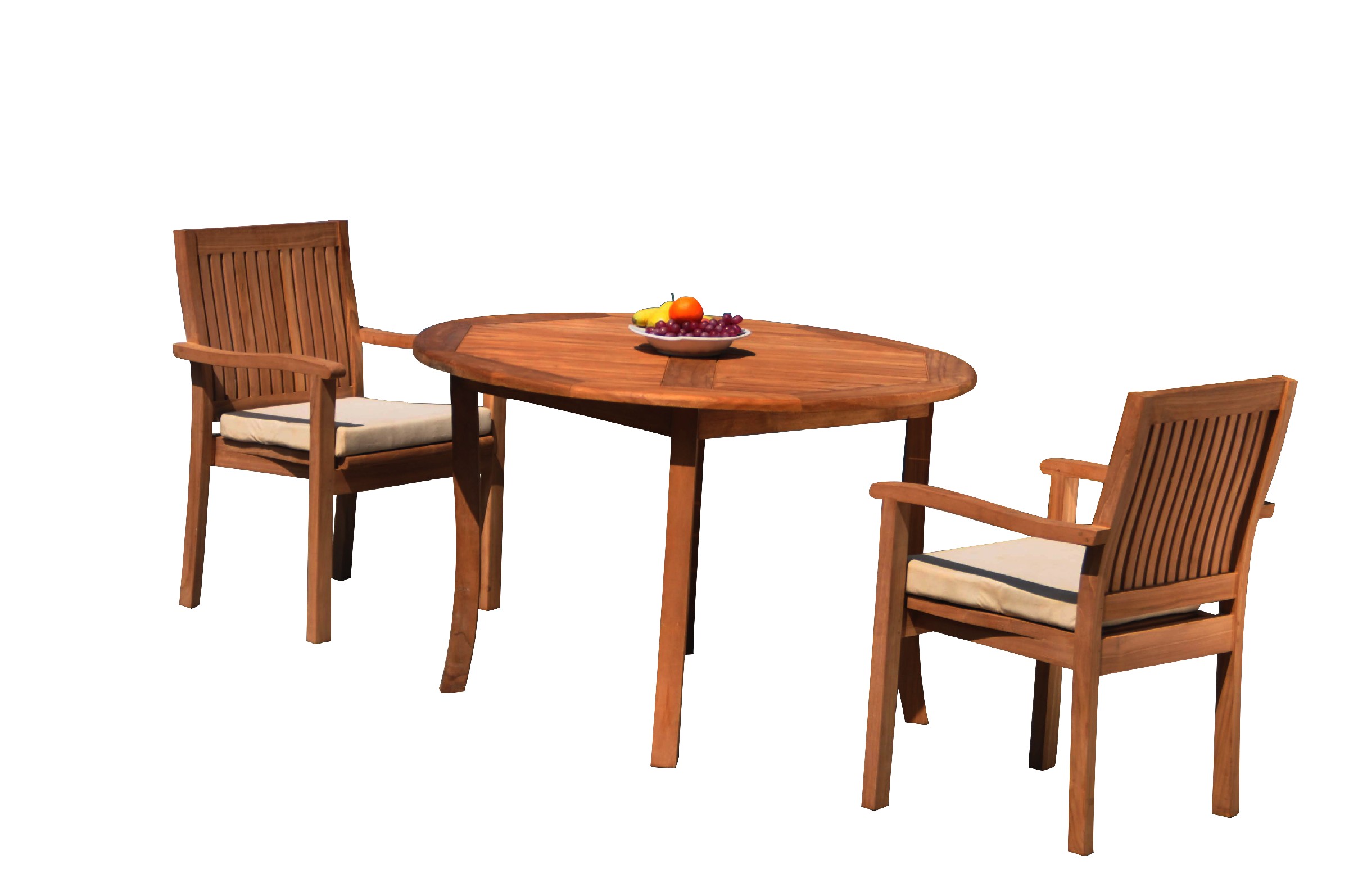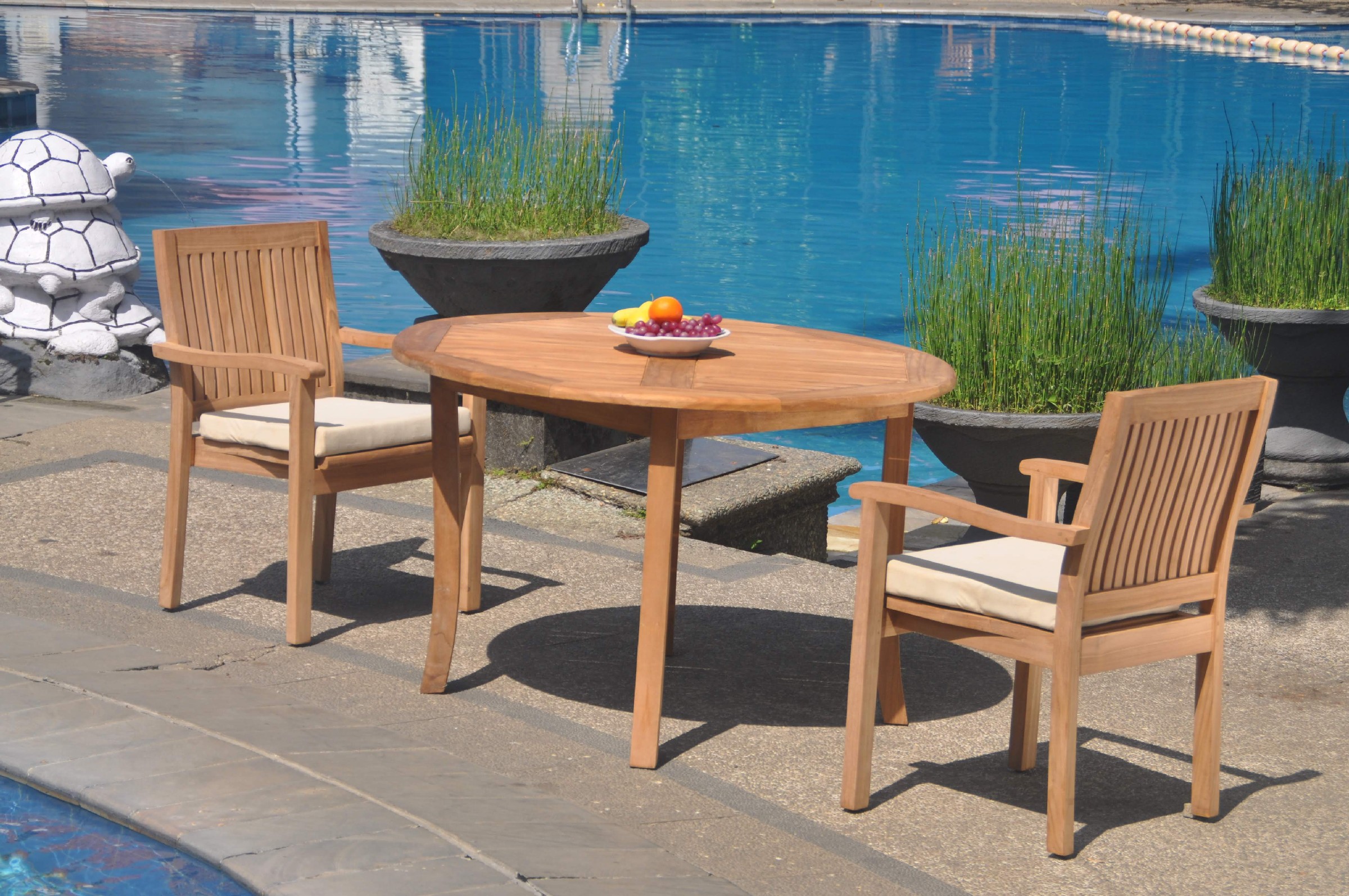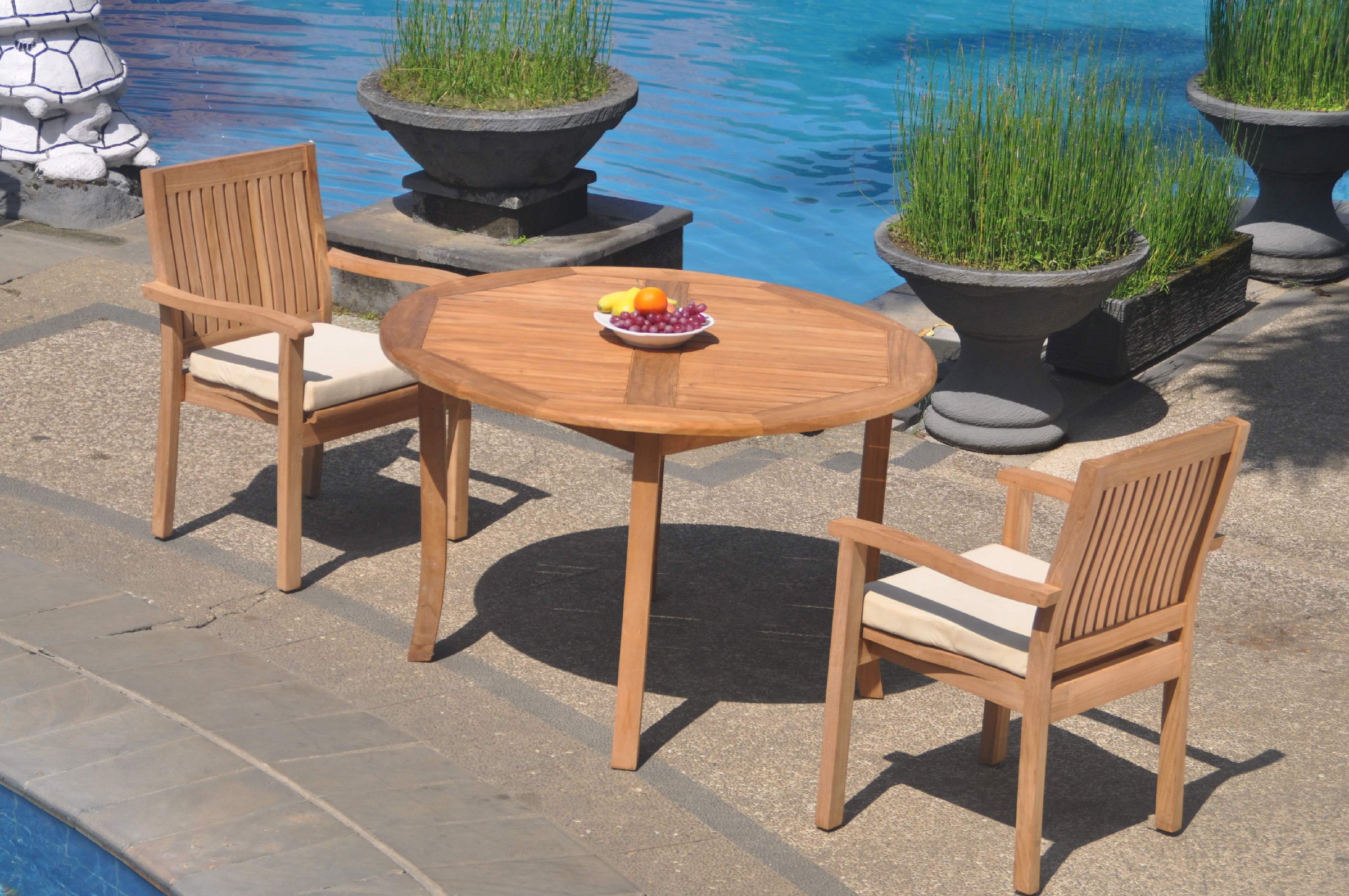 Set includes: 48" Round Table and 2 Leveb Stacking Arm Chairs. Pictures shown with more chairs is for illustration purpose only. You will receive only 2 chairs. ** Wood Umbrella Hole Plug is also provided. ** 2" Umbrella Hole is available in the middle of the table. ** Umbrella is not included with the set, but can be purchase separately, please inquire. ** DON'T FORGET TO ENQUIRE ABOUT OUR SUNBRELLA CUSHIONS (SOLD SEPARATELY) ** If you need more chairs, please let us know. ** Assembly: Very little assembly is required. This furniture will be delivered in partially assembled sections. Assembly is quick and simple. **Accessories shown in picture are not included with the set. Please inquire if you are interested.