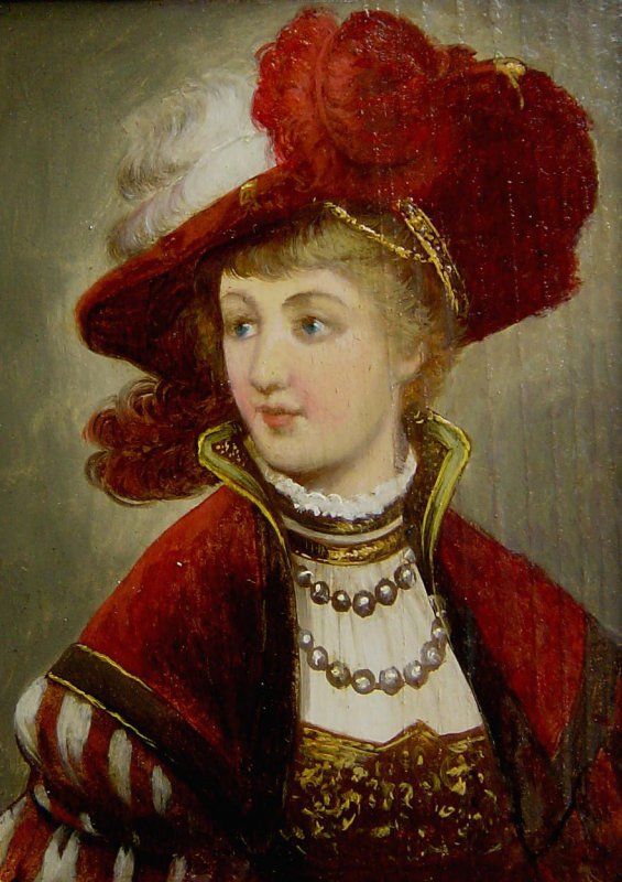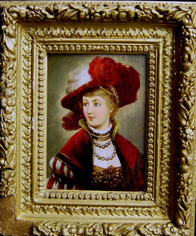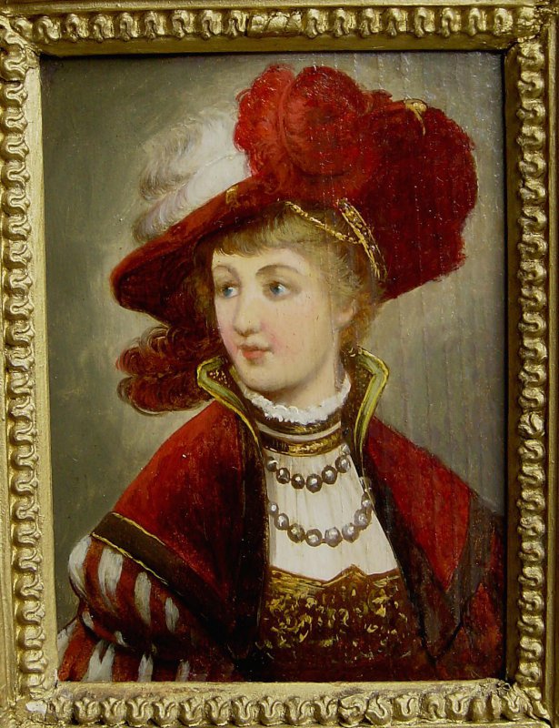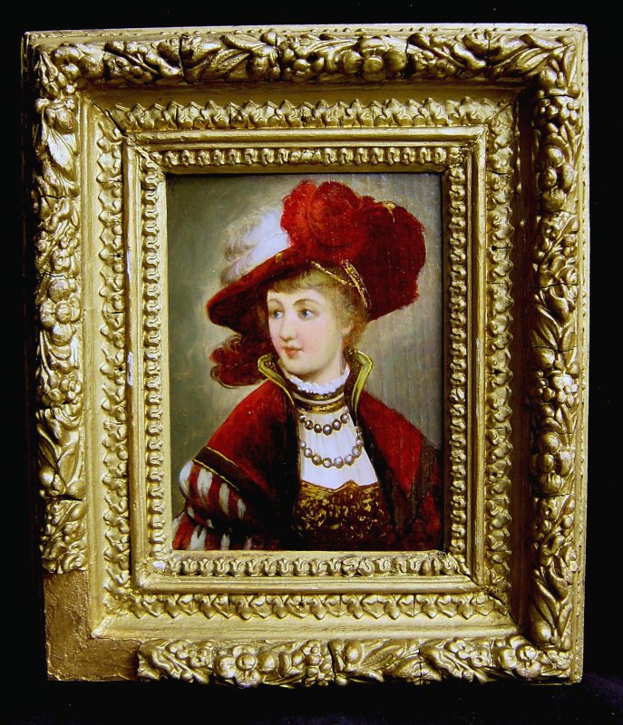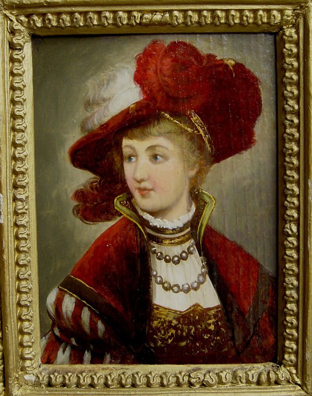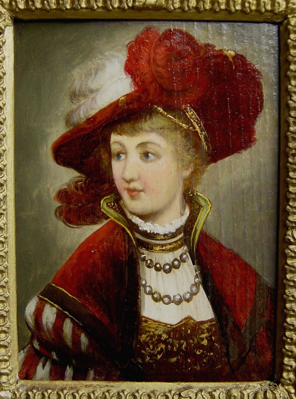 Altes Gemälde, Öl auf Holztafel im alten Rahmen Weitere Fotos unten im Angebot Motiv: Edeldame des 17. Jahrhundert mit FederhutAlter: um1810-60