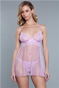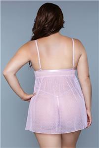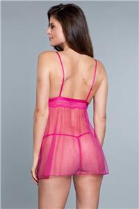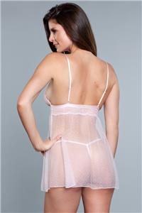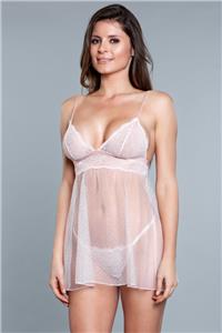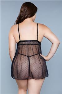 - Description: Sheer dotted mesh babydoll features a low cut front, adjustable straps and a matching g-string.