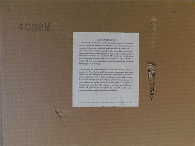 Size: 19" x 25" framed. Paper authentication label by The Collector's Guild, New York affixed to frame backing.