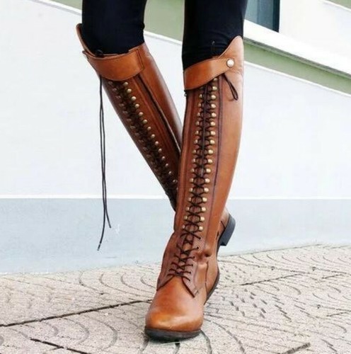 New Women Vintage Lace Up Knee High Riding Boots Casual Buckle Strap Shoes Punk