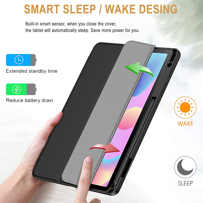 • Auto Schlaf / Wach Funktion - Durch die eingebauten magnetischen Streifen wird beim Öffnen/Schließen der Hülle der Ruhezustand automatisch aktiviert/deaktiviert, um Strom zu sparen.
