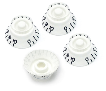 High quality WHITE Recessed Bell Knobs for Gibson Les Paul, SG and other guitars (Set of 4). Fits 24 fine-spline (imperial) split shaft pots commonly found on USA Gibsons, CTS pots, etc.