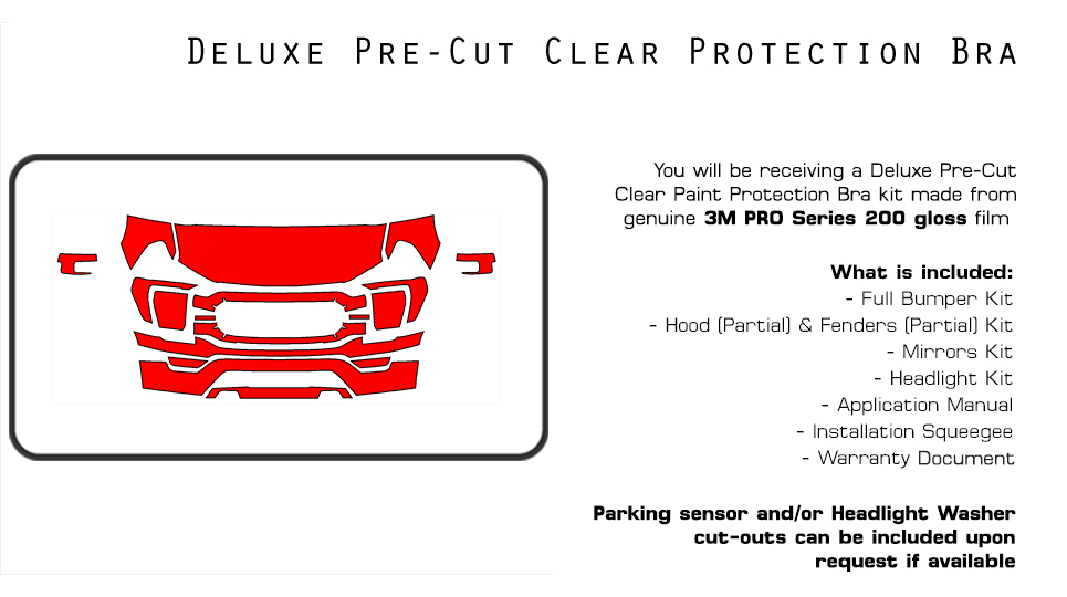 Q: Which areas of my car will be protected? A: Our Deluxe Kit will include pieces for the bumper, hood (partial size), fenders (partial size), headlights, and mirrors.