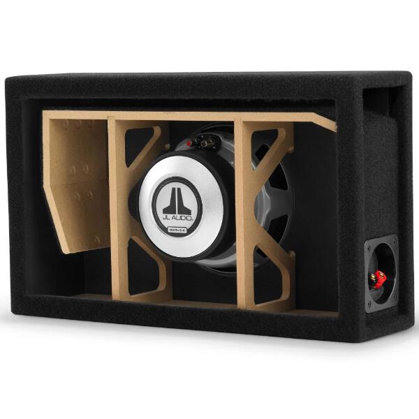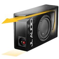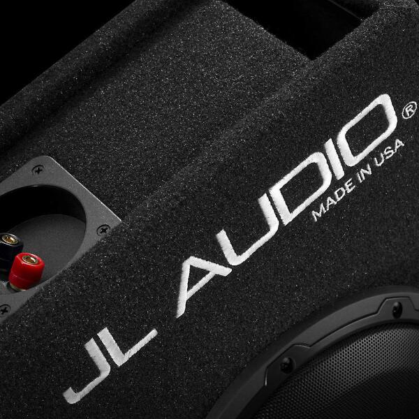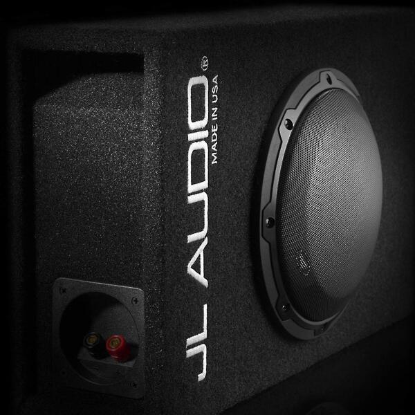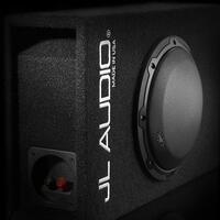 Finish: Black, high-grade automotive carpet with silver "JL AUDIO" embroidery on front baffle. A steel mesh grille is included to protect the subwoofer driver.