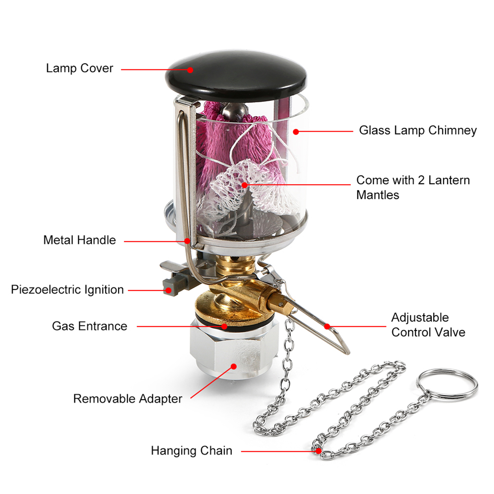 Mini outdoor gas lamp with high-energy ceramic piezoelectric ignition system,can ensure a successful ignition. Its compact and ultralight design adds more convenience for outdoor activities such as camping,hiking,fishing,traveling etc.
