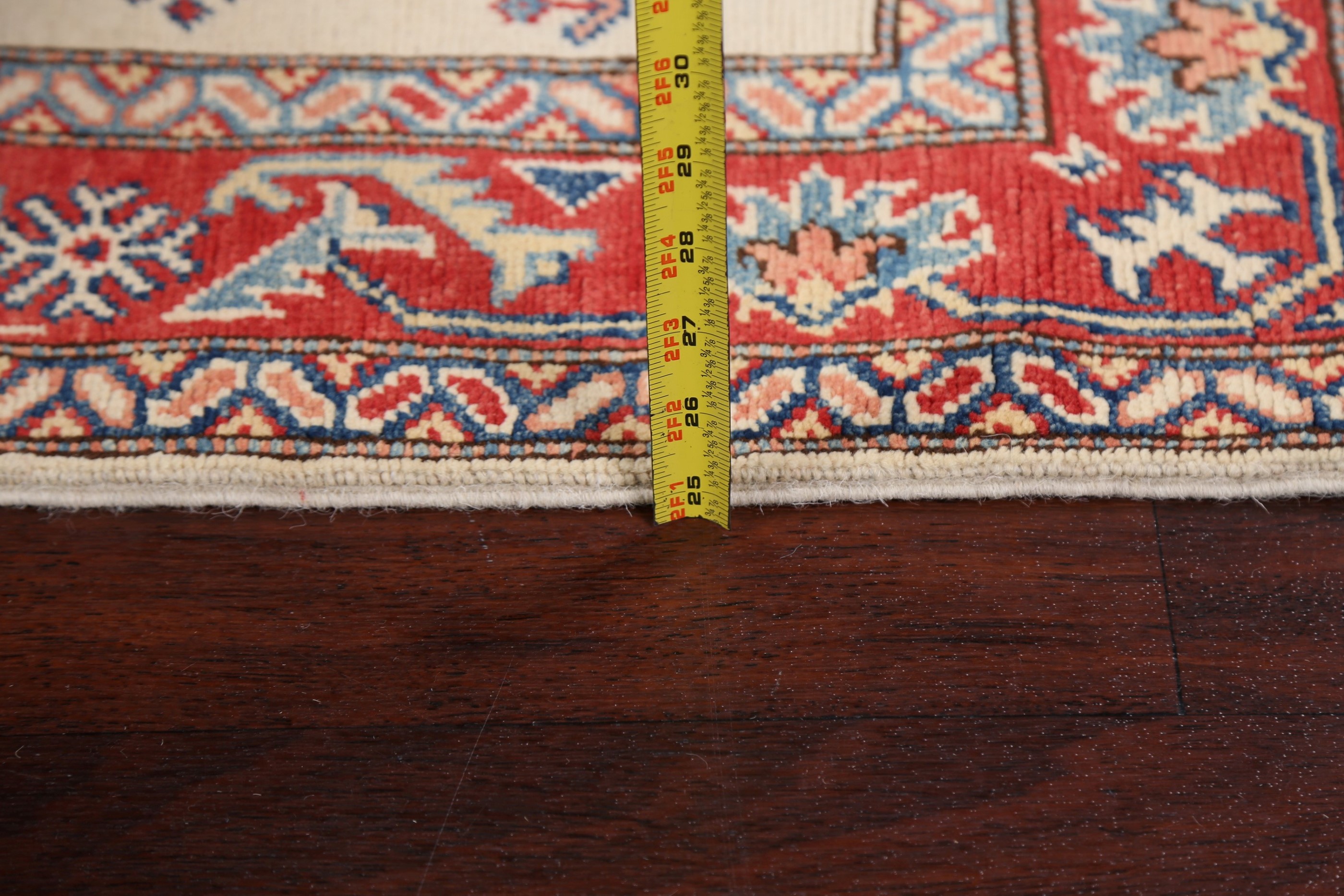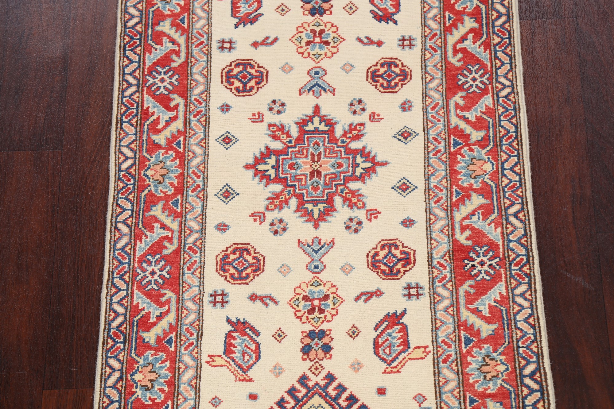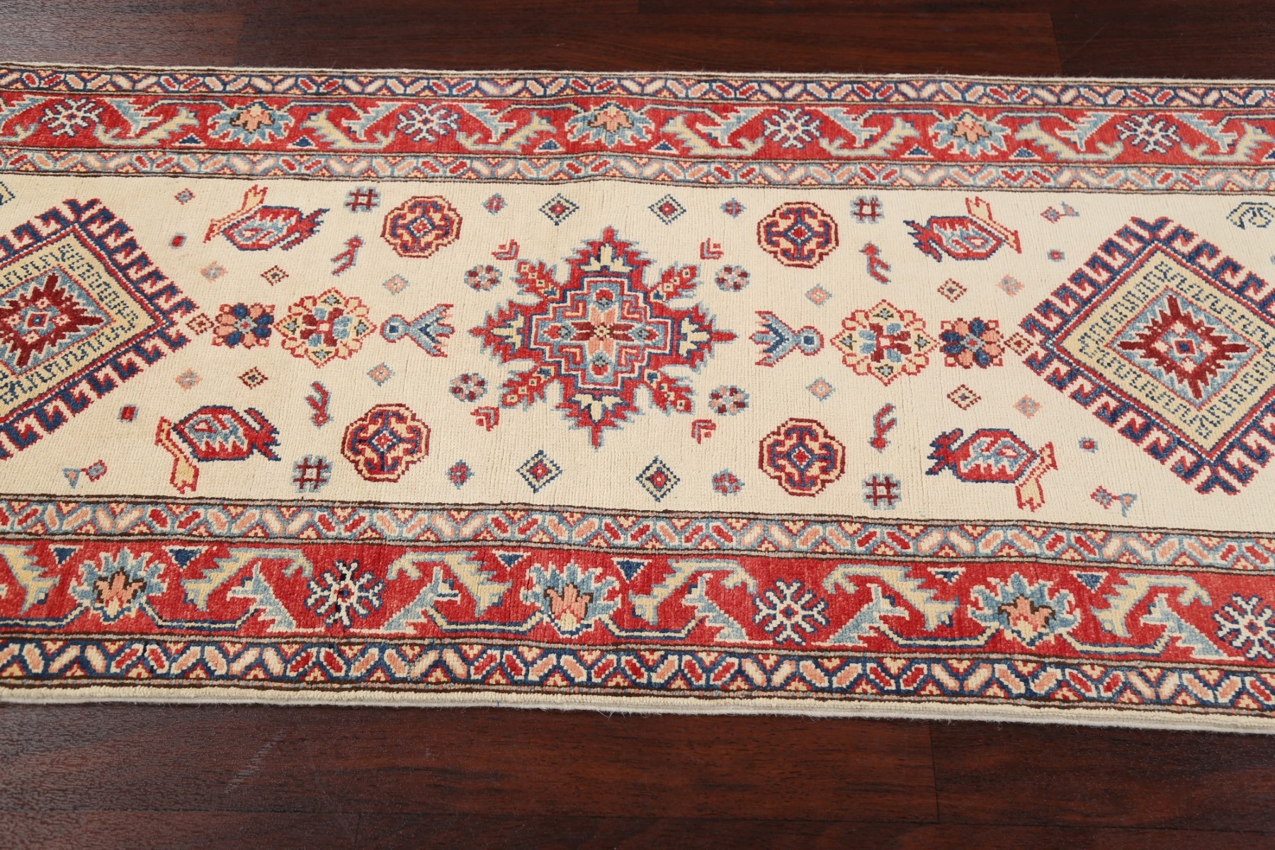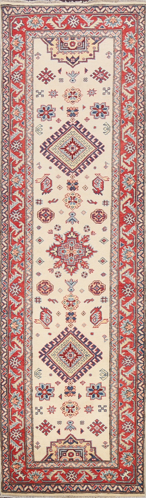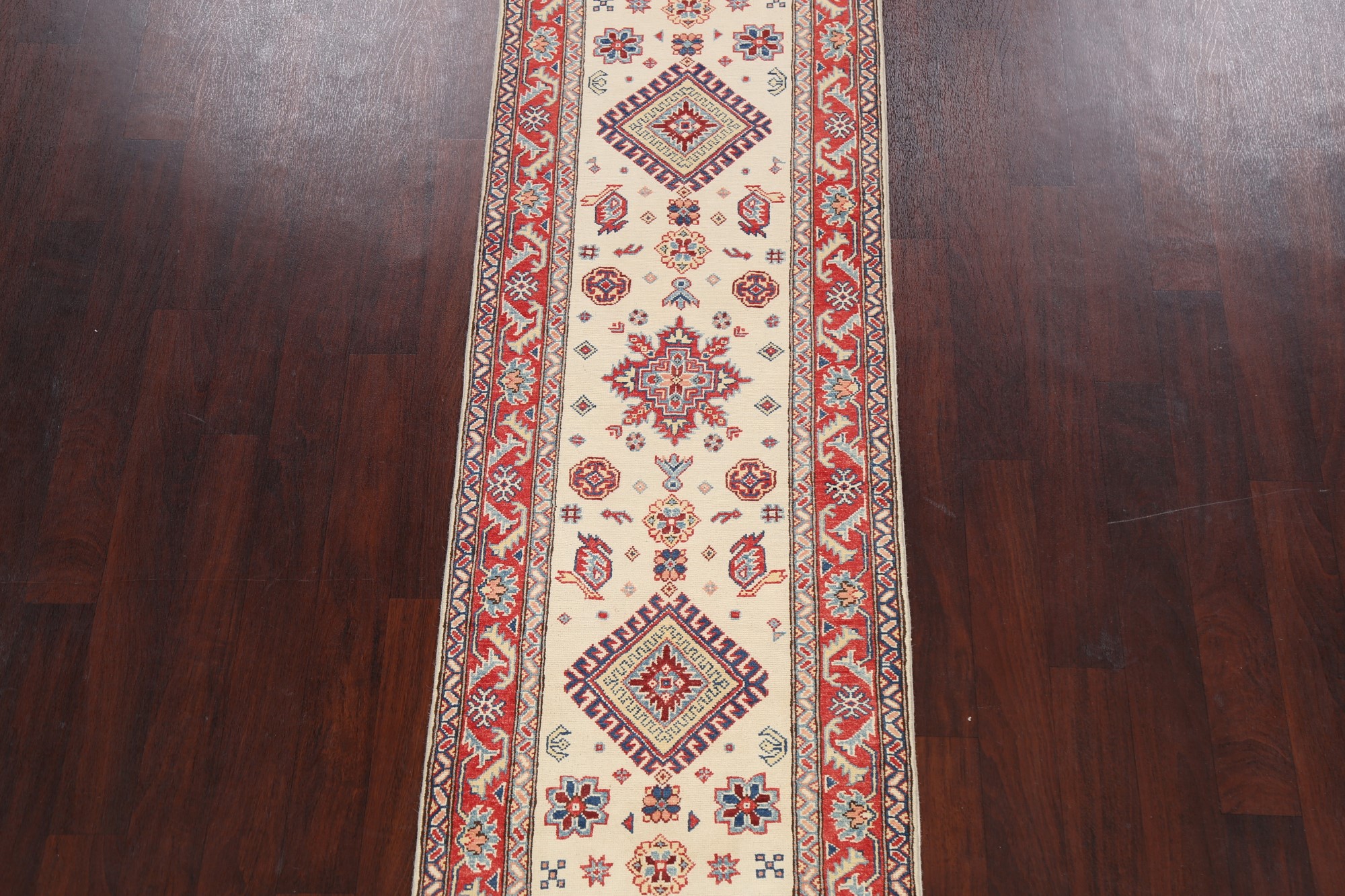 Geometric Ivory Super Kazak Oriental Runner Rug Vegetable Dye Hand-knotted 3x9