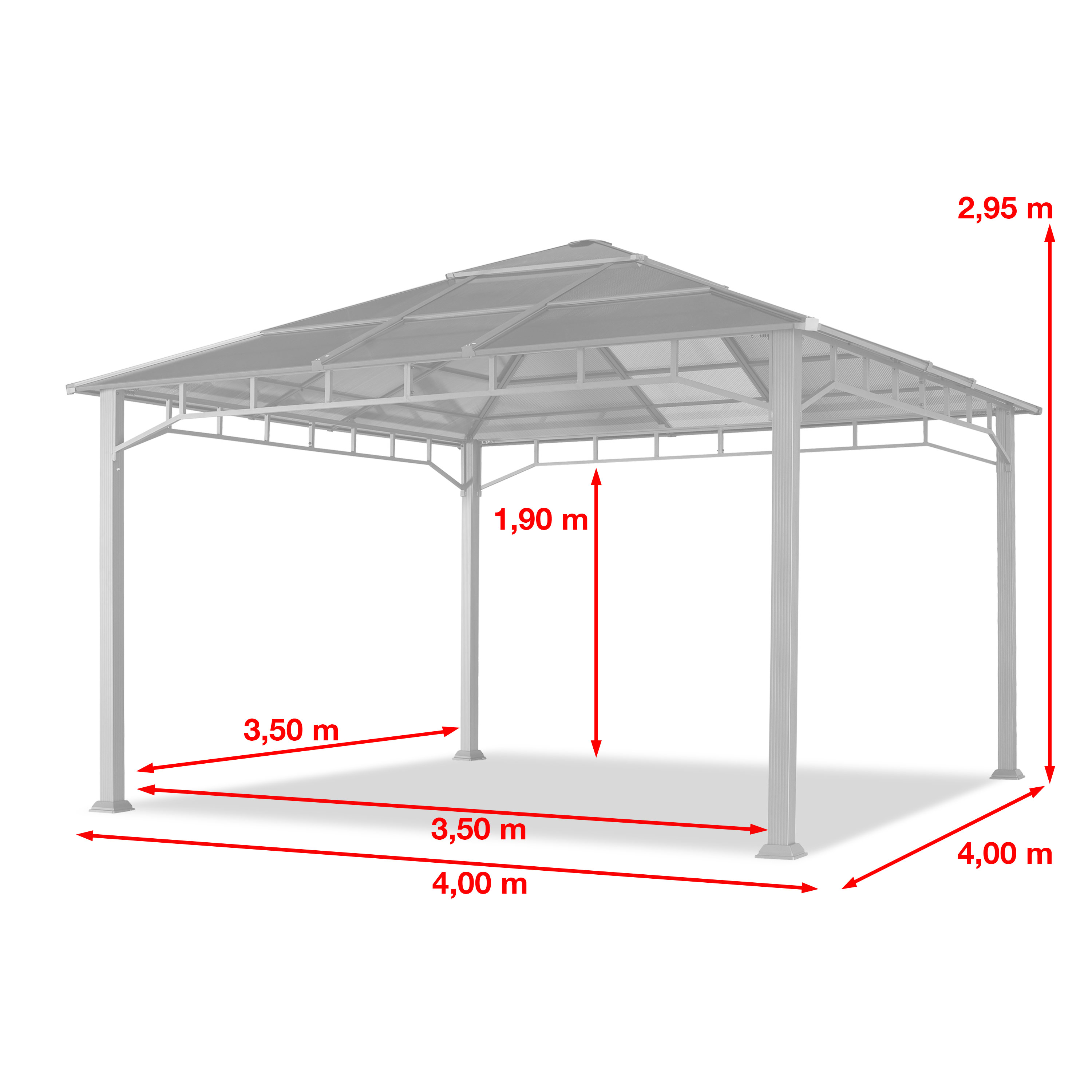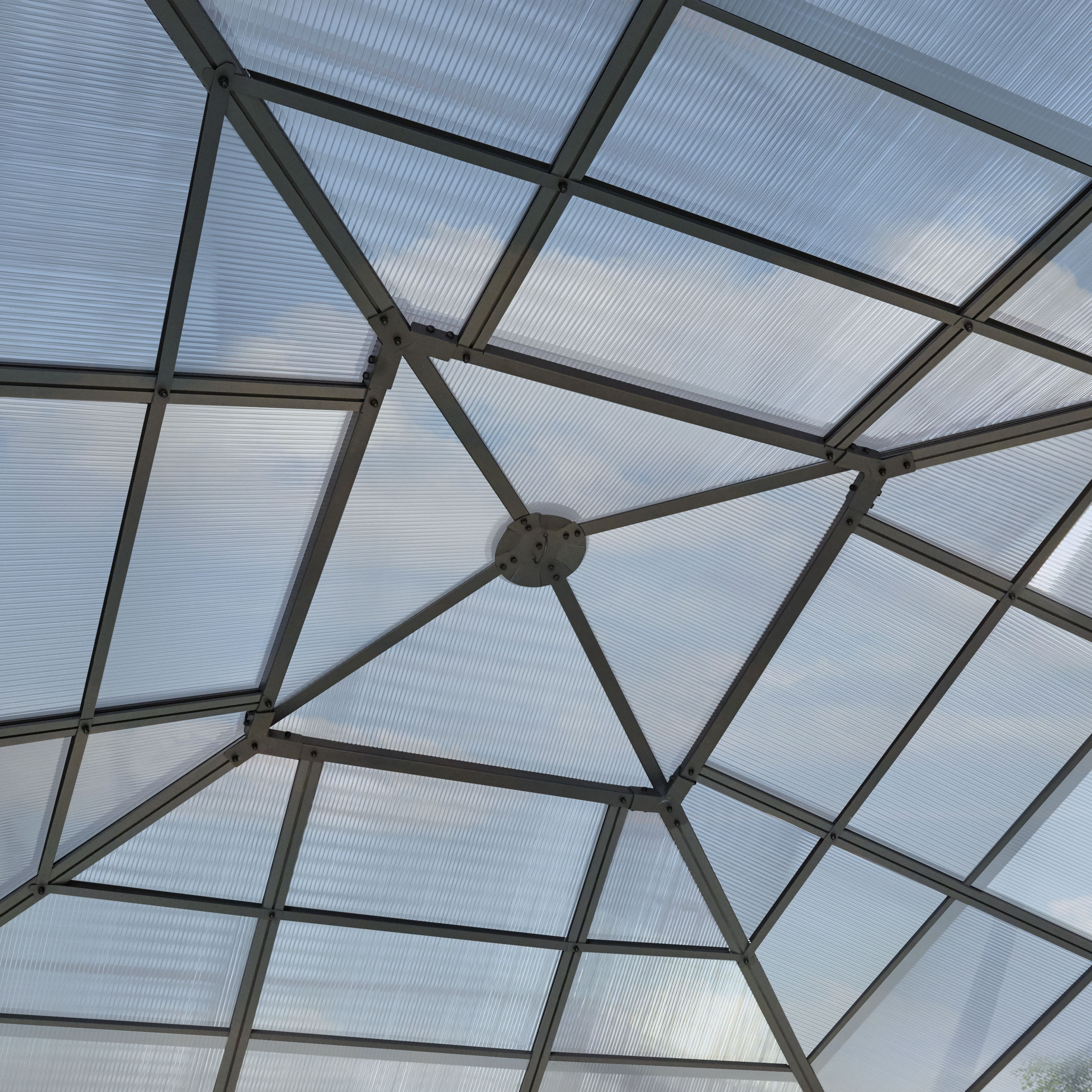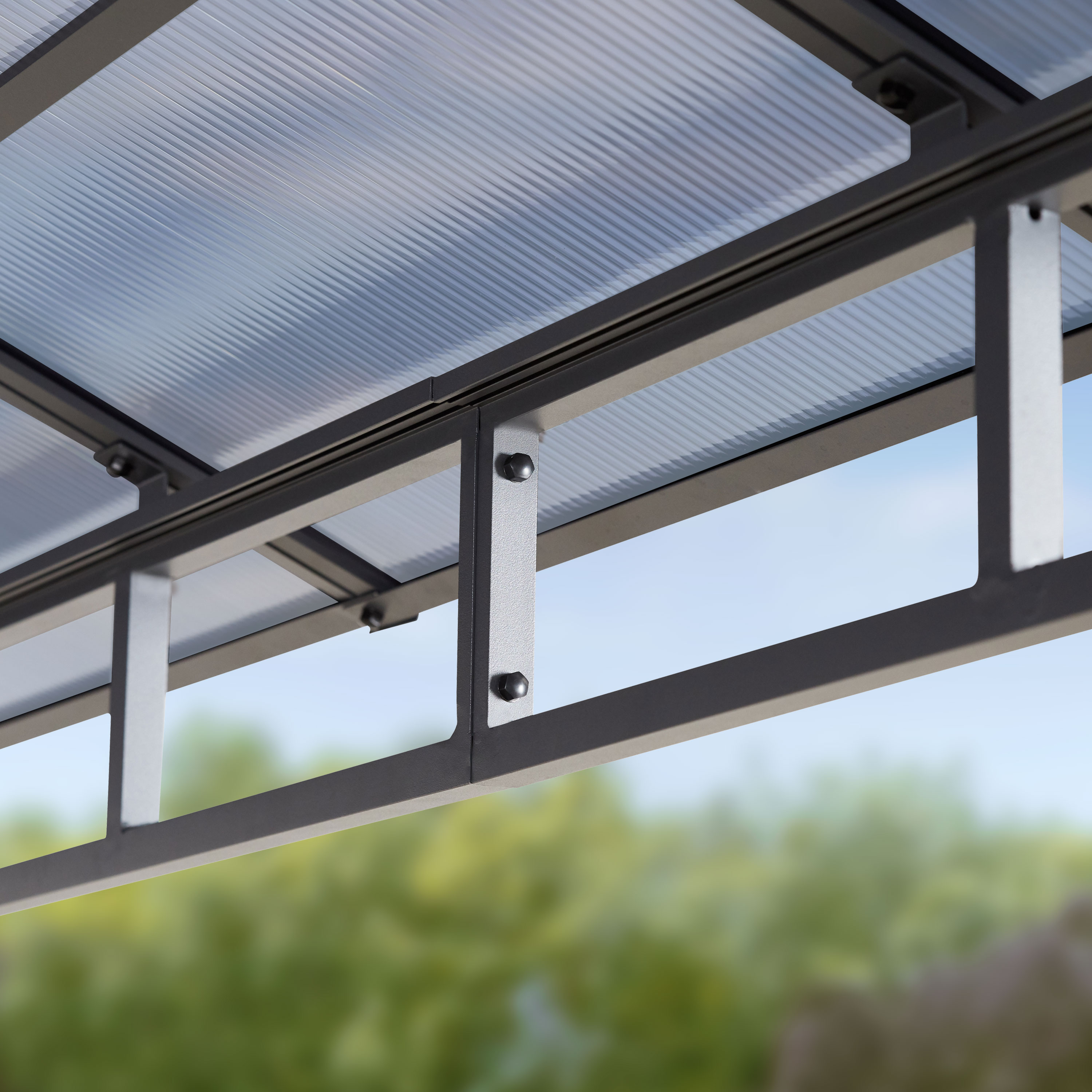 ALLES DABEI: Aluminiumgestänge, Polycarbonat Dachplatten, 4 Seitenteile mit Haken zum Aufhängen, 8 Betonanker zur sicheren Befestigung im Fundament, Montagewerkzeug, Aufbauanleitung