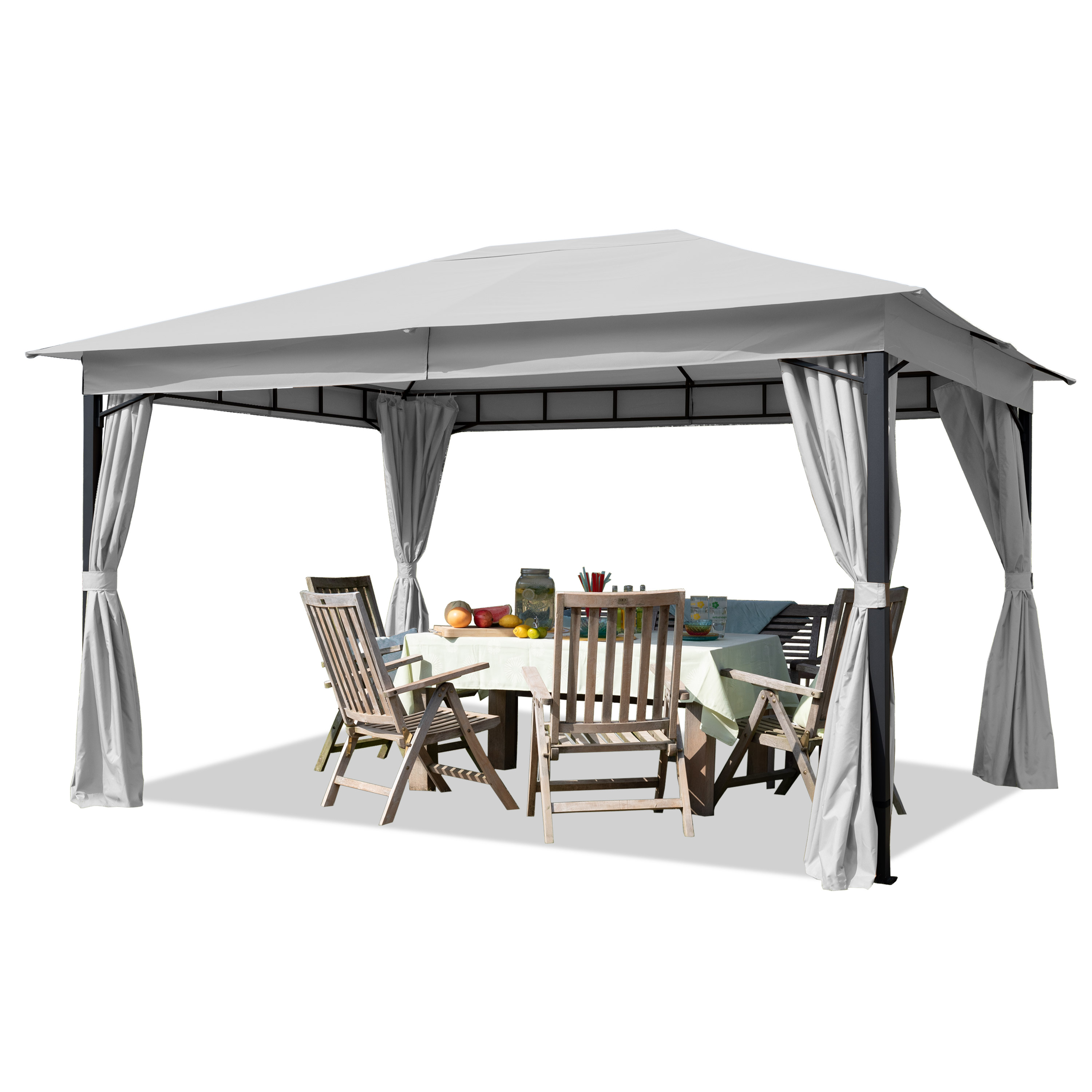 Laden Sie Ihre Freunde und Verwandte zum Wintergrillen ein - der Gartenpavillon 4x4 m bietet ausreichend Platz für ein großes Grillfest. Diese große Fläche eignet sich zudem ideal als Dekorationsraum oder zur Aufrüstung eines Outdoor-Wohnzimmers. Passend für diese Anlässe sind bereits Haken zur Befestigung von Deko-Materialien oder Beleuchtungen in der Konstruktion integriert.