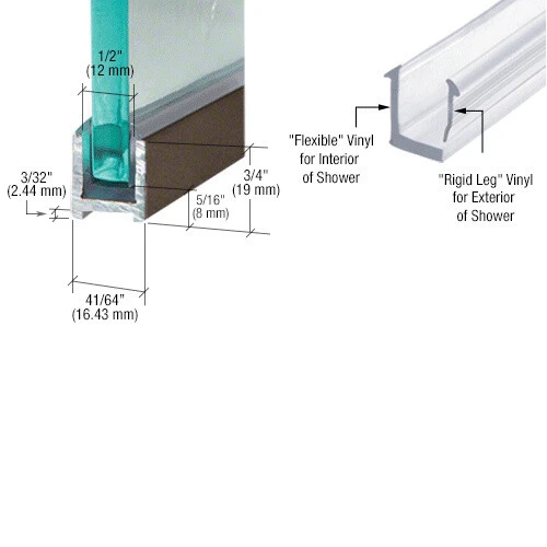 This oil rubbed bronze dry glaze U channel is designed to secure 3/8 inch glass without the use of silicone, allowing a cleaner installation and easier future glass replacement if needed. The channel is made from extruded aluminum and is supplied with both flexible and rigid clear vinyl inserts that hold the glass firmly in place. The flexible vinyl is positioned on the interior side of the shower, while the rigid vinyl rolls into the exterior side to complete the installation. The channel comes wrapped in a protective poly sleeve and includes a 95 inch length suitable for a variety of shower or panel mounting applications. The design features a recessed bottom that helps conceal the caulk line for a more finished appearance once installed. This channel is available in finishes that coordinate with matching end caps, allowing the installer to achieve a consistent look when completing the enclosure. It provides an efficient dry glazing solution that reduces installation time and simplifies maintenance by eliminating the need to cut away cured sealant. The materials include 6463-T5 extruded aluminum along with rigid and flexible clear vinyl components to support the glass securely within the channel.