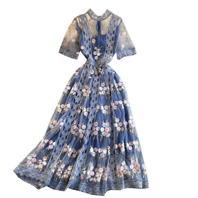 Lady Mesh Embroidery Floral Dress Midi Lace Short Sleeve Hollow Out Fairy Casual