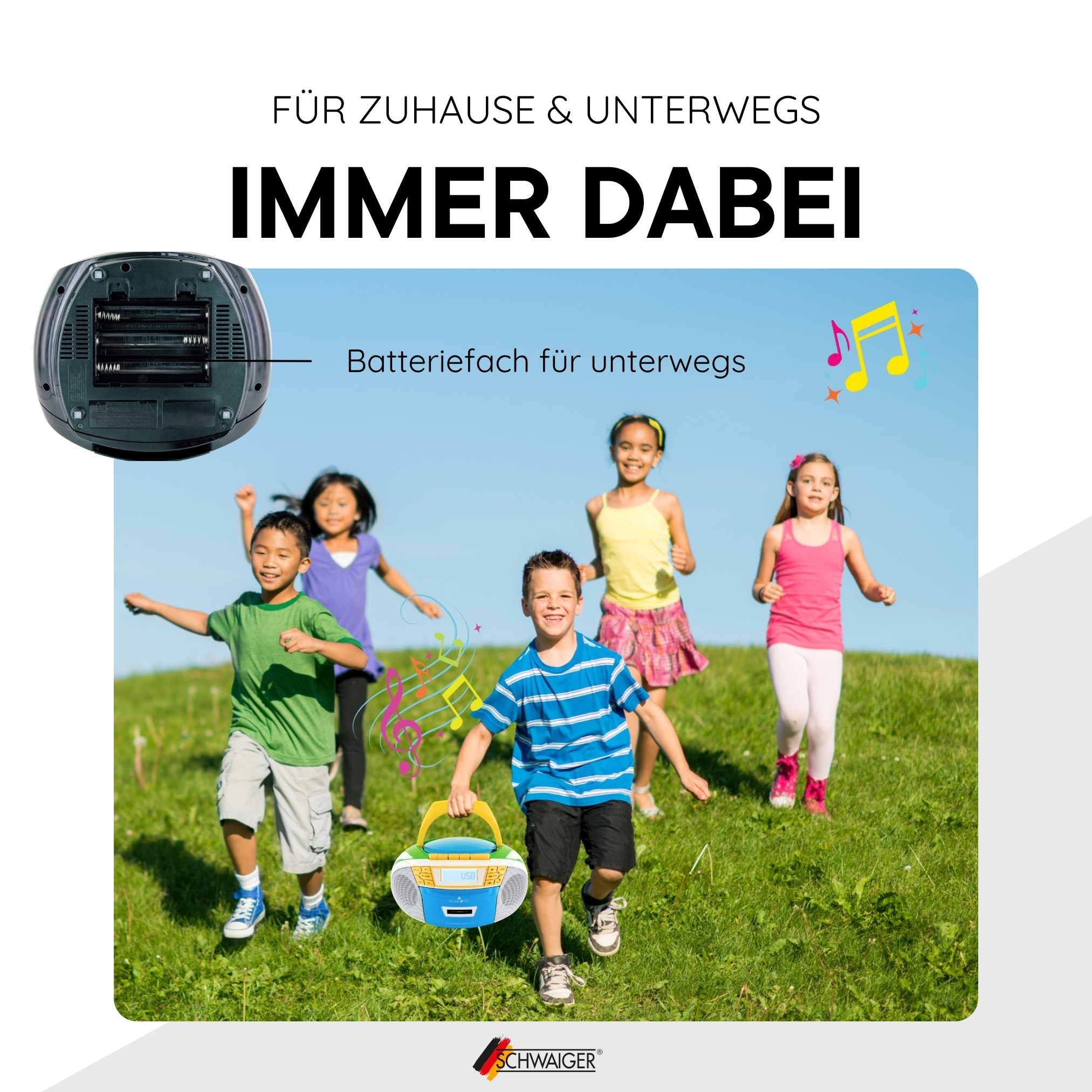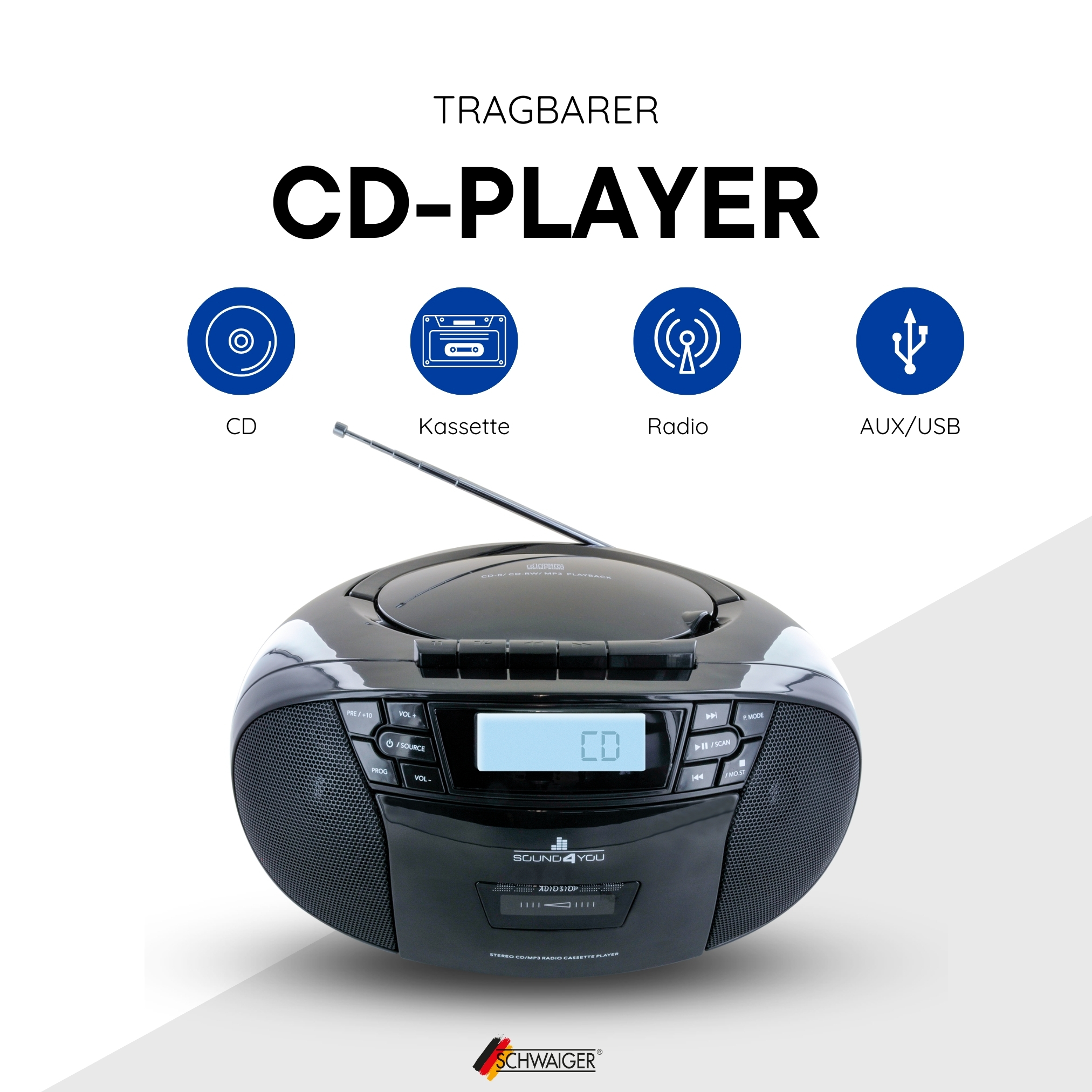 Die portable Boombox von SCHWAIGER® vereint einen CD-Player, einen Kassettenspieler sowie ein FM Radio in einem und bietet dabei eine Vielzahl an Wiedergabemöglichkeiten: Spielen Sie Ihre Lieblings-CDs ab, begeistern Sie Ihre Kinder mit klassischen Hörspielkassetten oder schließen Sie über AUX und USB Ihre modernen Wiedergabegeräte an. Und das fast überall, wo Sie gerade sind. Denn die Boombox können Sie einfach über das Netzkabel zuhause anschließen oder mit dem praktischem Tragegriff bequem batteriebetrieben überall hin mitnehmen.