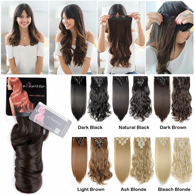 Texture: Straight / Curly Wavy 8Pcs full head clip in hair extensions Feature: Soft as Natural Human, Strong Endurable Material: Synthetic Hair,High Temperature Fiber Length: 17inch=43cm,23inch=58cm, 24inch=60cm,26inch=66cm Weigth: 140g (net), 175g (gross) Package included: 8 pieces/set with 18 clips attached