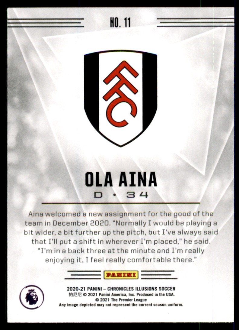 | Description: | Ola Aina | | Category: | Soccer | | Year: | 2020 | | Product: | Panini Chronicles | | Set: | Illusions | | Team: | Fulham | | Card Number: | 11 | | Dimensions: | 3½" x 2½" |