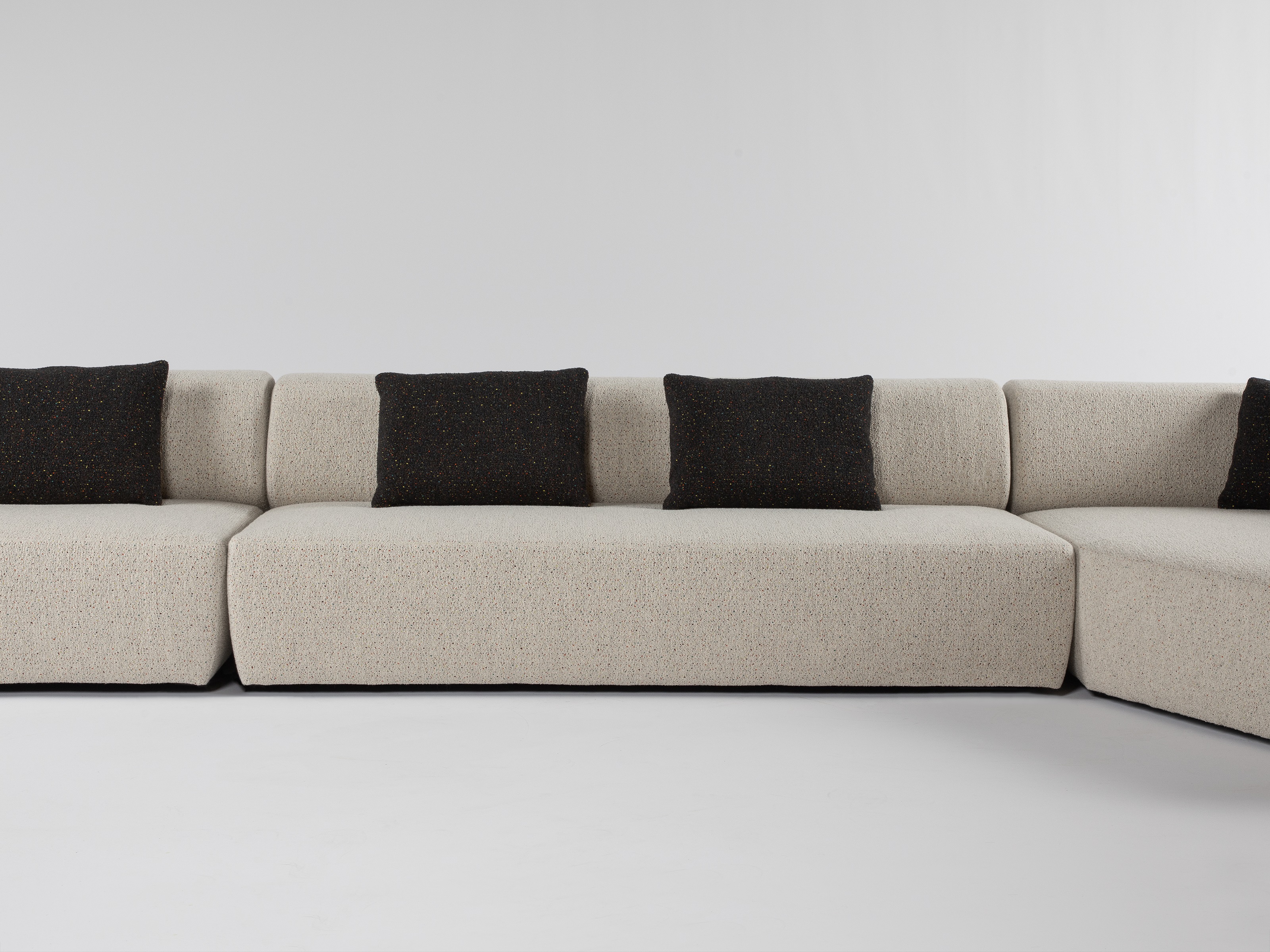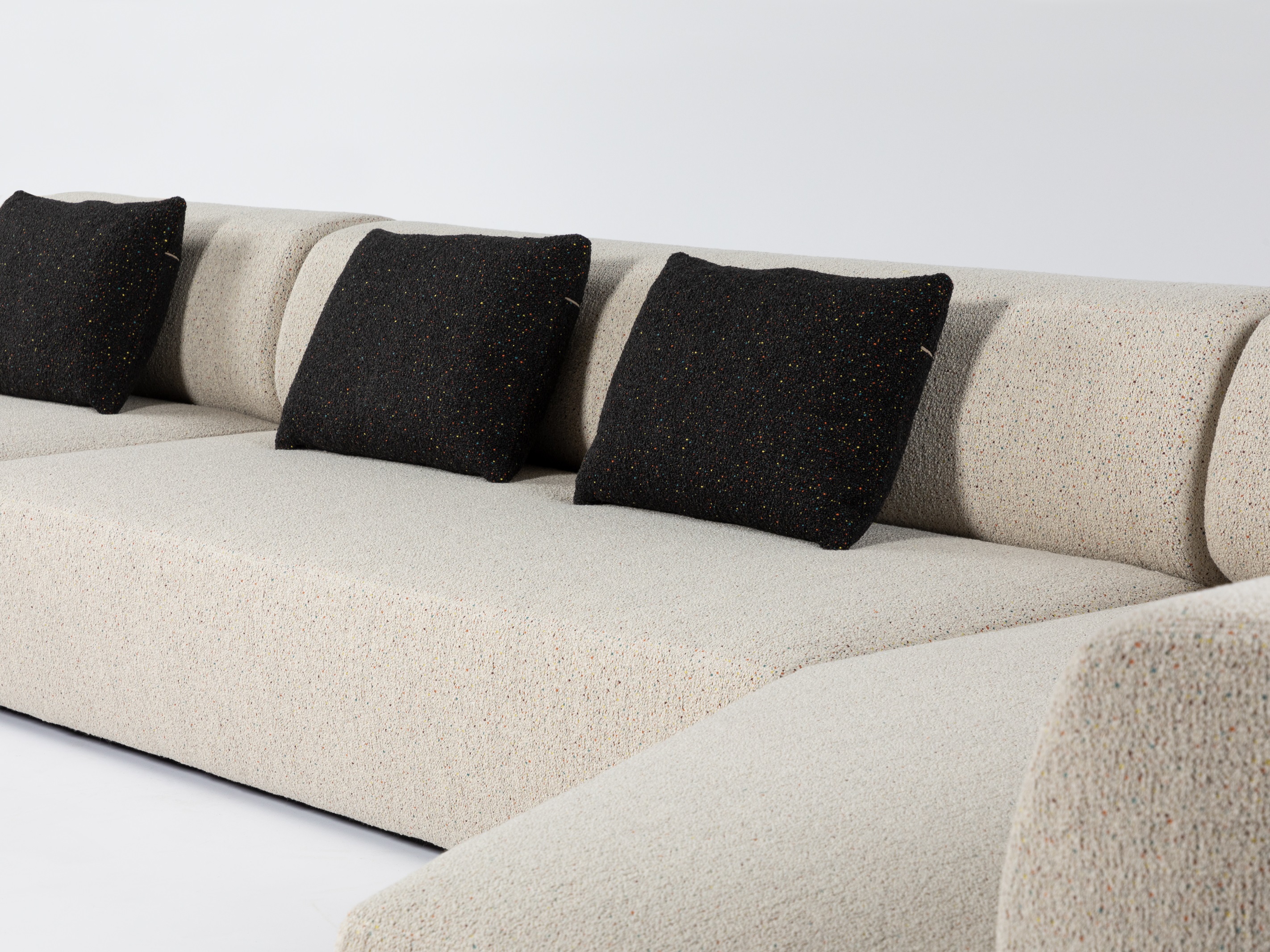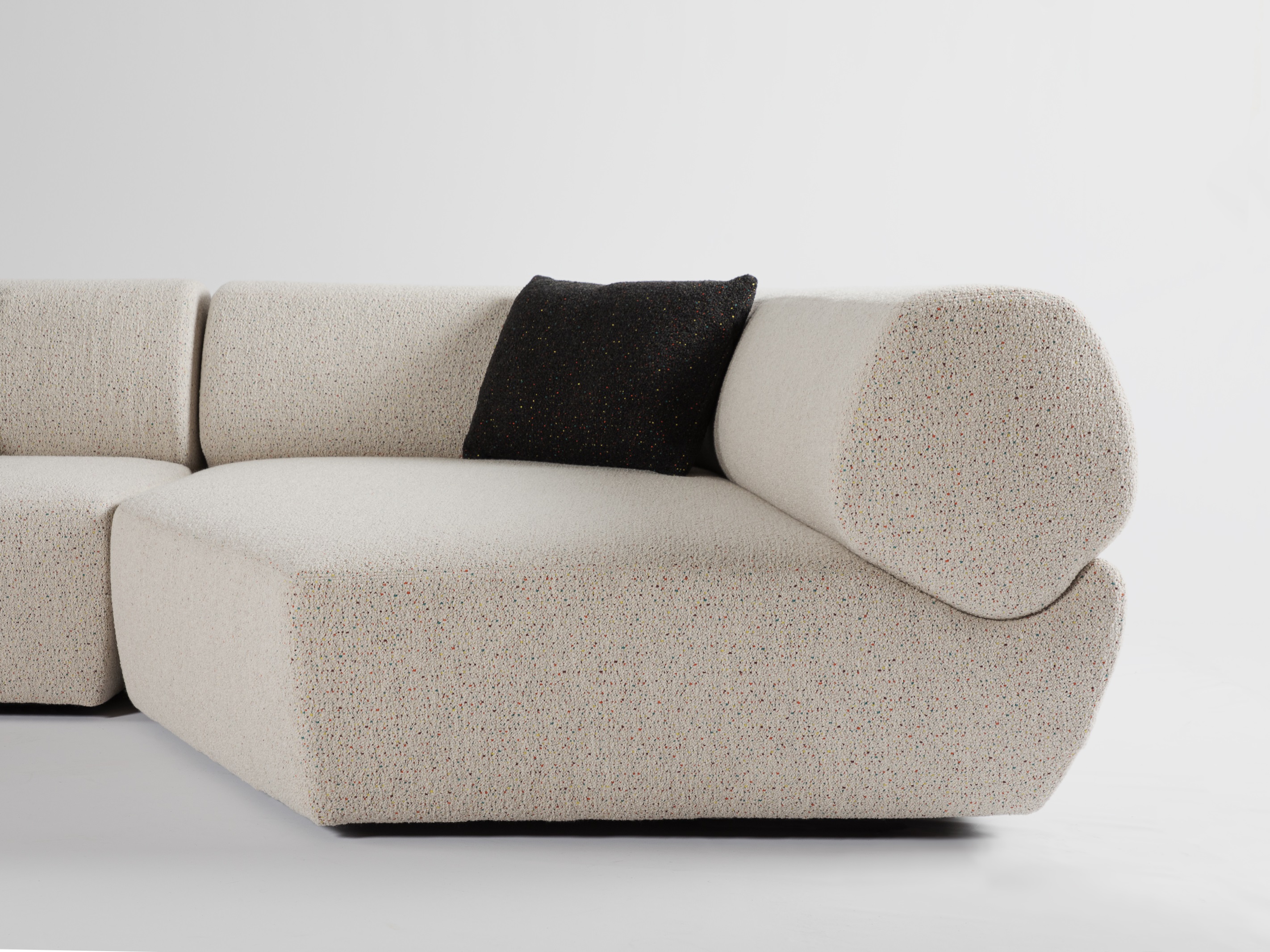 A visual dialogue between structure and shapes, the Naviglio seating collection is made up of curved, linear, and terminal elements, chaise lounges, and ottomans. Synthesis is the project’s essence and starts from its name. The seating base is a riverbed that defines the space to accommodate a backrest/armrest which is as sinuous as a watercourse. As a piece of a puzzle, each shape is ergonomically designed into a single cohesive unit. The backrest section and the seating reveal a delicate balance between polygons and curved shapes, where geometry becomes softness and rigor blends with comfort. The different elements’ upholstery is made of flexible polyurethane, to welcome and correctly support the body. The choice was dictated by the object’s nature – a sofa without seat cushions. The covers are available in a wide range of fabrics and shades. The backrest back features a continuous decorative insert, providing a linear element that further emphasizes the shape’s continuity.