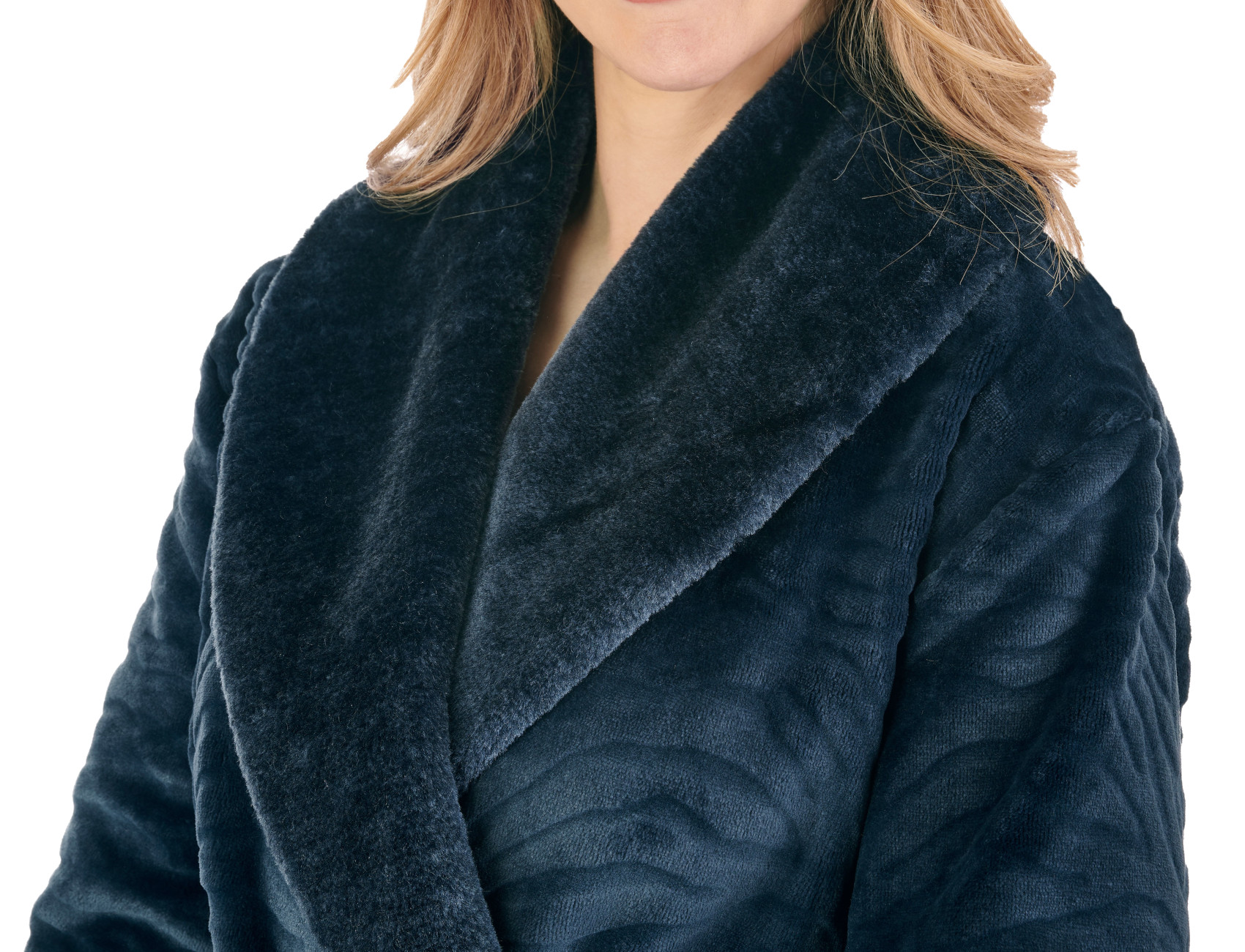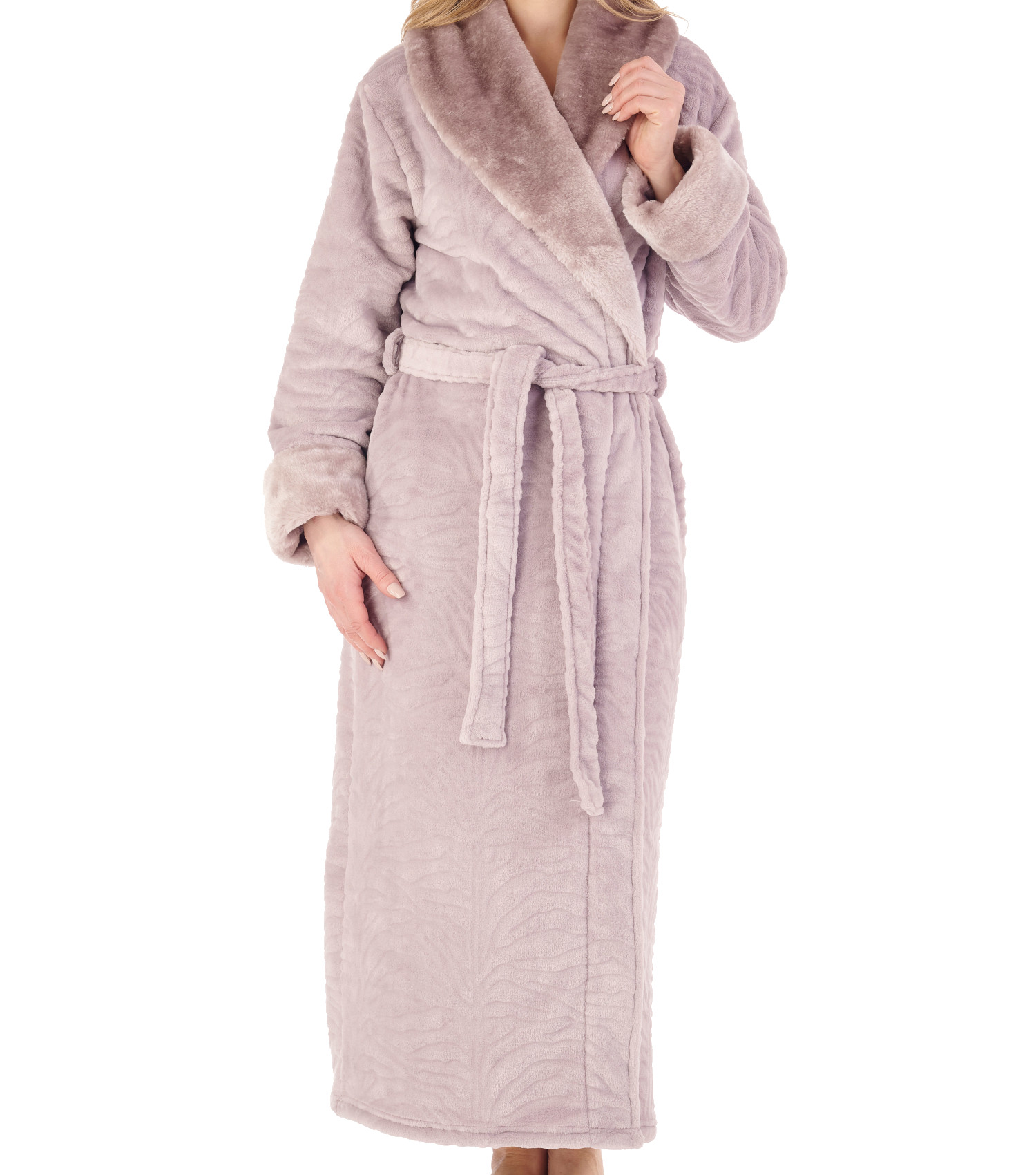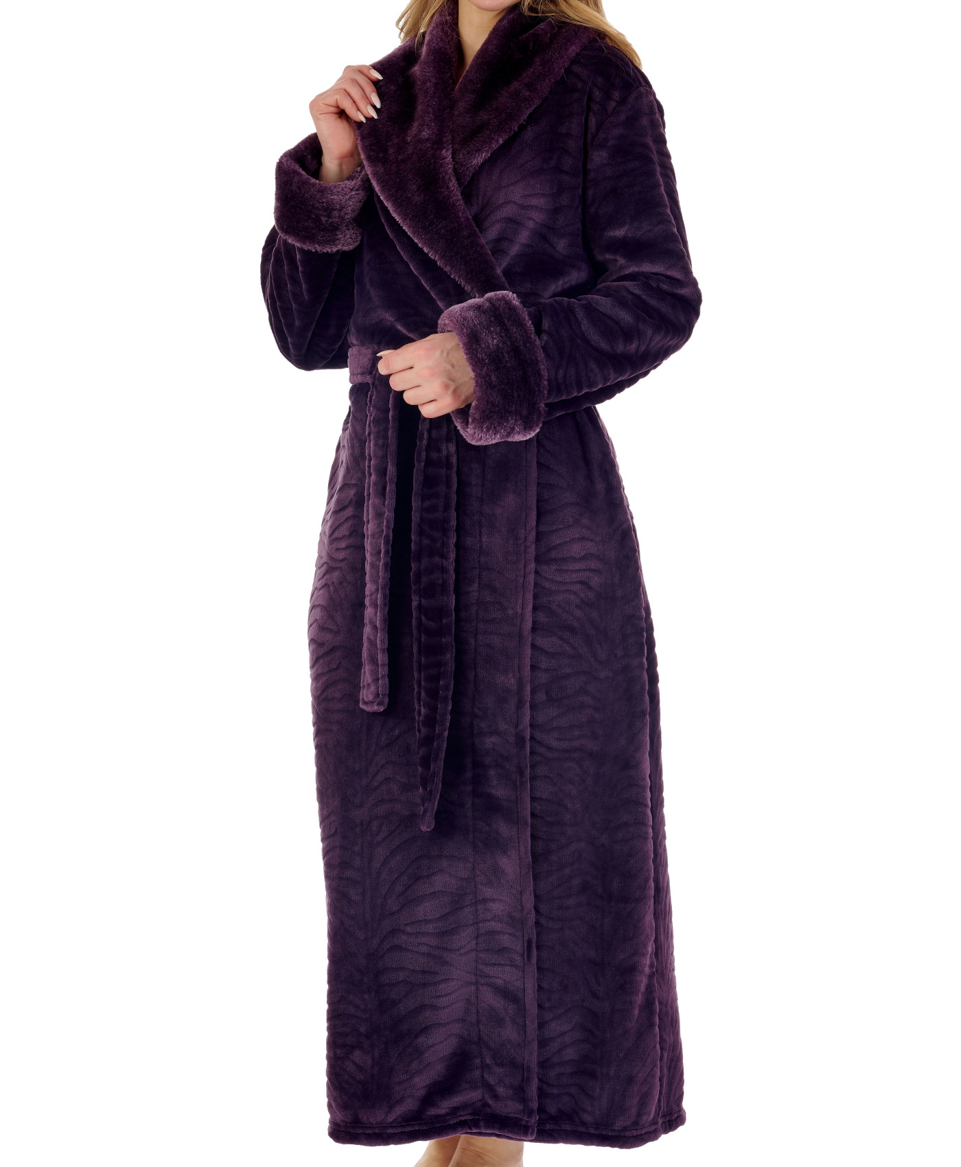 - These ladies wrap around dressing gowns by Slenderella are made from super soft zebra inspired fleece and have faux fur detail to the shawl collar and cuffs of the sleeves.