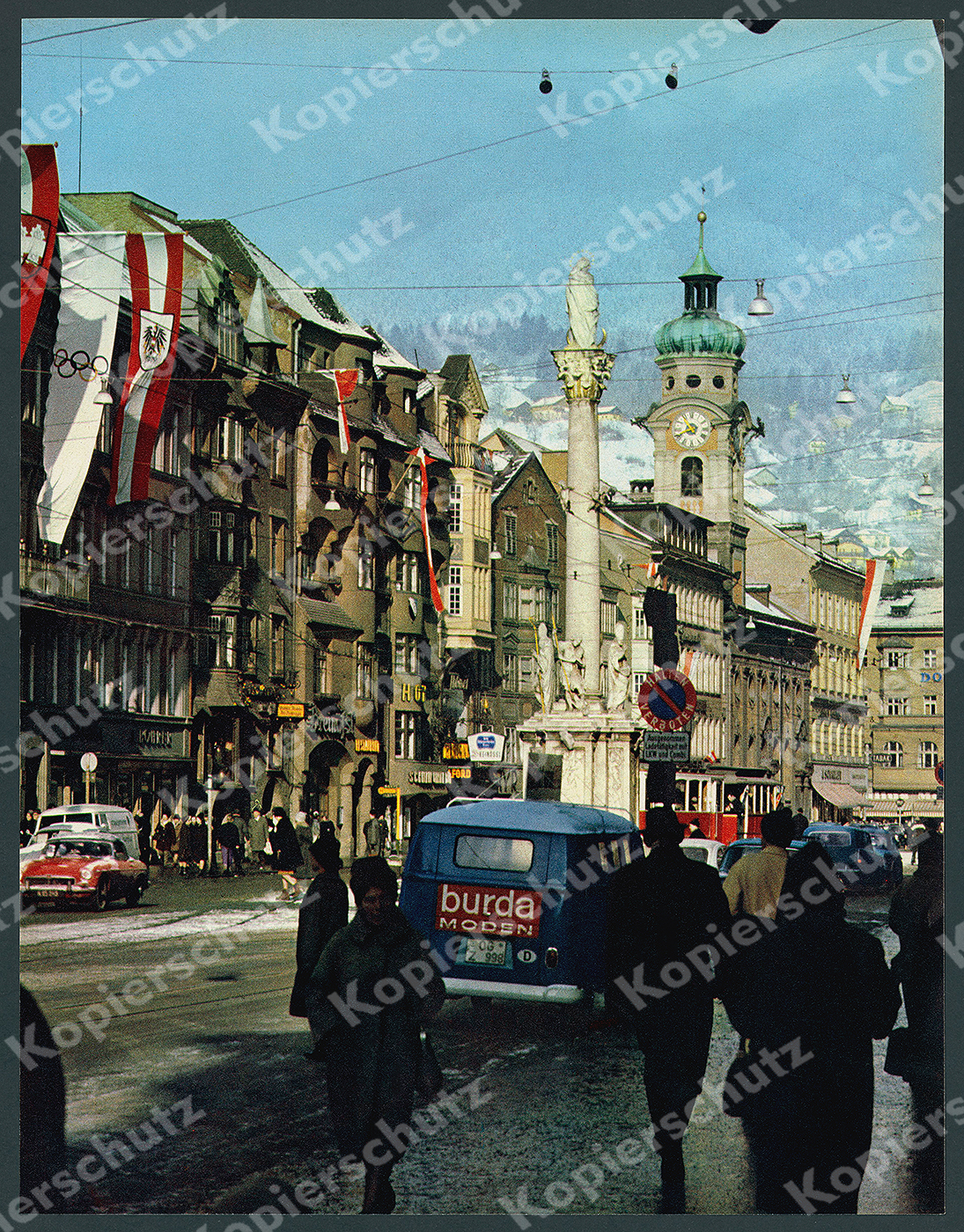 Zu Rückgabe und AGB bitte mich-Seite beachten. Die dort hinterlegten Informationen sind verbindlicher Bestandteil dieses Angebots/dieser Artikelbeschreibung!1964, 20. Jahrhundert, 60er – Jahre, A-6020 Innsbruck, Abfahrt, Abfahrtslauf, Alpen, Alpenländer, alpenländisch, Alpenwelt, alpin, Alpinismus, Alpinistik, Alpinskifahren, Austriaca, Auto, Autofahren, Autohersteller, Automarken, Automobil, Automobilbranche, Automobile, Automobilgeschichte, Automobilismus, Bahn, Bahnanlagen, Bahnbetrieb, Bahnlinie, Bahnstation , Bahnstrecke, Bahnstrecken, Bahnsystem, Bahntechnik, Beförderungsmittel, Befördung, Berge, Bergwelt, deutsche Automobil-Geschichte, Deutsche Geschichte, deutsche Industrie, Deutsche Wirtschaft, Deutsche Wirtschaftsgeschichte, Eisenbahn, Eisenbahnbetrieb, Eisenbahnfahrzeuge, Eisenbahngeschichte, Eisenbahnlinie, Eisenbahntechnik, Eisenbahnwagen, Eisenbahnwaggon, Eisenbahnwesen, elektrische Straßenbahnen, elektrischer Betrieb, Elektrotechnik, Fahrdienst, Fahren, Fahrzeug, Fahrzeuge, Firma, Firmen, Firmengeschichte, Firmenlogo, Firmenwerbung, Firmenzeichen, FIS, Fremdenverkehr, Gebirge, Großindustrie, Großstadt, Großstadtverkehr, gute alte Zeit, Haltestelle, Heimat, Heimatbelege, Heimatkunde, historical, Historically, Historisch, historische Automobile, Historische Bilder, Historische Eisenbahn, historische Fahrzeuge, History, Hochgebirge, Industrie, Industriegeschichte, Industrieunternehmen, Industriezweig, Kfz, Kombi-Lieferwagen, Kraftfahrzeug, Kraftfahrzeuge, Kraftfahrzeugindustrie, Kraftverkehrswirtschaft, Kraftwagen, Landeskunde, Langlauf, Langstreckenläufer, Leibesertüchtigung, Leistungssport, Lichtbild, Marke, Marken, Markenlogo, Markenzeichen, Metropole, nordische Kombination, Nordkette, Nostalgia, Nostalgie, Nutzfahrzeuge, Öffentliche Verkehrsmittel, Öffentlicher Personennahverkehr, Oldtimer, Olympia , Olympiade, Olympic, Olympic Games, olympisch, Olympische Spiele, Olympische Winterspiele, ÖPNV, Ortsansichten, Ortsgeschichte, Ortskunde, Österreich, Österreichische Geschichte, Personennahverkehr, Pkw, Railway, Schi, Schienen, Schienenfahrzeug, Schienenverkehr, Schienenwagen, Sechziger Jahre, Sixties, Ski, Skifahren, Skilanglauf, Skilauf, Skilaufen, Skirennen, Sport, Sportereignis, Sportgeschichte, Sportveranstaltung, Stadtansichten, Stadtbahn, Stadtentwicklung, Stadtgeschichte Innsbruck, Städtische Straßenbahnen, Straßenbahn, Straßenbahnlinie, Straßenbahnlinien, Straßenbahnnetz, Straßenfahrzeug, Straßenszene, Straßenverkehr, System Technik, Systemtechnik, System-Technik, Technik, Technikgeschichte, Tirol, Topographie, Tourismus, Touristik, Tram, Trambahn, Tramway, Transport, Transporter, Transportmittel, Transporttechnik, Transportwesen, Unternehmen, Unternehmensgeschichte, Verkehr, Verkehrsmittel, Verkehrswesen, Vintage Print, Volkswagen, VW, VW Bulli T1, VW Bully, VW Transporter, Wagen, Wettkampf, Wettkampfsport, Wettkampfwesen, Wettspiele, Winter, Winterolympiade, Winterspiele, Wintersport, Wirtschaft, Wirtschaftsgeschichte, Wirtschaftsleben, Wirtschaftsunternehmen, Wirtschaftswunder, Wirtschaftswunderzeit, Zeitgeschehen, Zeitgeschichte, Zug Die Olympischen Winterspiele 1964 (auch IX. Olympische Winterspiele genannt) wurden vom 29. Januar bis 9. Februar 1964 in der österreichischen Stadt Innsbruck ausgetragen. Wahl des Austragungsortes Nachdem sich Innsbruck bereits für 1960 beworben hatte und bei der 51. Session des IOC Squaw Valley unterlagen war, konnte es sich bei der 55. IOC-Session am 26. Mai 1959 in München in einem einzigen Wahlgang gegen Calgary und Lahti durchsetzen, wobei letztere deshalb ganz durchfielen, da die Voraussetzungen nicht voll erfüllt waren. Vorolympische Spiele 1963 wurden in Seefeld (zwischen 30. Januar und 3. Februar) nordische und auf den alpinen Rennstrecken am Patscherkofel und in der Axamer Lizum (zwischen 15. und 17. Februar) Vorolympia-Bewerbe durchgeführt. Den 30-km-Langlaufbewerb holte sich am 30. Januar Einar Østby, den 10-km-Langlauf der Damen am 31. Januar gewann Alewtina Koltschina. Am 31. Januar/1. Februar gab es auch die Nordische Kombination: Laufsieger: wurde Horst Möhrwald (FRG) vor Alois Kälin und Enzo Perrin (ITA), Sprungsieger Georg Thoma vor Erkka Luiro (FIN) und Willi Köstinger, womit im Endklassement Thoma vor Günther Meinel (GDR) und Tormod Knutsen (NOR) gewann (Rang 6 ging an Köstinger, Rang 15 Kälin, der gestürzt war). Am 2. Februar gewann der Italiener Marcello De Dorigo vor Lars Olsson (SWE) und Reidar Hjermstad (NOR) den 15-km-Langlauf, die 3×5-km-Staffel der Damen brachte einen Sowjeterfolg vor Schweden, GDR und einer internationalen Mannschaft. Letztlich gab es am 3. Februar Spezialskispringen mit keiner überragenden Beteiligung: Sieg Akemi Taniguchi (JAP) vor Rainer Dietel (AUT). Die alpinen Bewerbe begannen mit dem Damenslalom am 15. Februar in der Lizum, wobei Edith Zimmermann mit 2,94 s Vorsprung auf Heidi Biebl gewann, da aber mehr als die Hälfte der Teilnehmerinnen scheiterte, wurde diese Generalprobe zur Farce, es war vorsichtiges, defensives Fahren gefragt gewesen. Das Hauptaugenmerk galt der Abfahrt am 16. Februar am Patscherkofel, wo Jos Minsch mit Nr. 22 einen dreifachen österreichischen Erfolg (Nenning, Schranz, Zimmermann) verhinderte, die Franzosen hingegen ihren momentanen Ruf als Abfahrer nicht zu verbessern vermochten. Es wurde über starken Windeinfluß am Starthang geklagt. Am Schlusstag wurden noch die Damenabfahrt und der Herrenslalom ausgetragen, womit auch die Kombinationsentscheidungen fielen. Bei den Herren lauteten die Resultate: Slalom: Nenning, Bonlieu, Schranz, Adolf Mathis und Kombination Nenning, Schranz, Zimmermann, Lacroix, Adalbert Leitner, Ludwig Leitner (beide FRG); Rang 8 Senoner, 9. Périllat, 12. Georg Grünenfelder. Bei den Damen gewann Christl Haas die Abfahrt vor Henneberger, Christl Staffner; Rang 5: Christine Goitschel, 6 Annie Famose, 12 Fernande Bochatay; die Kombination ging an Edith Zimmermann vor Biebl, Pia Riva; Rang 6 Si