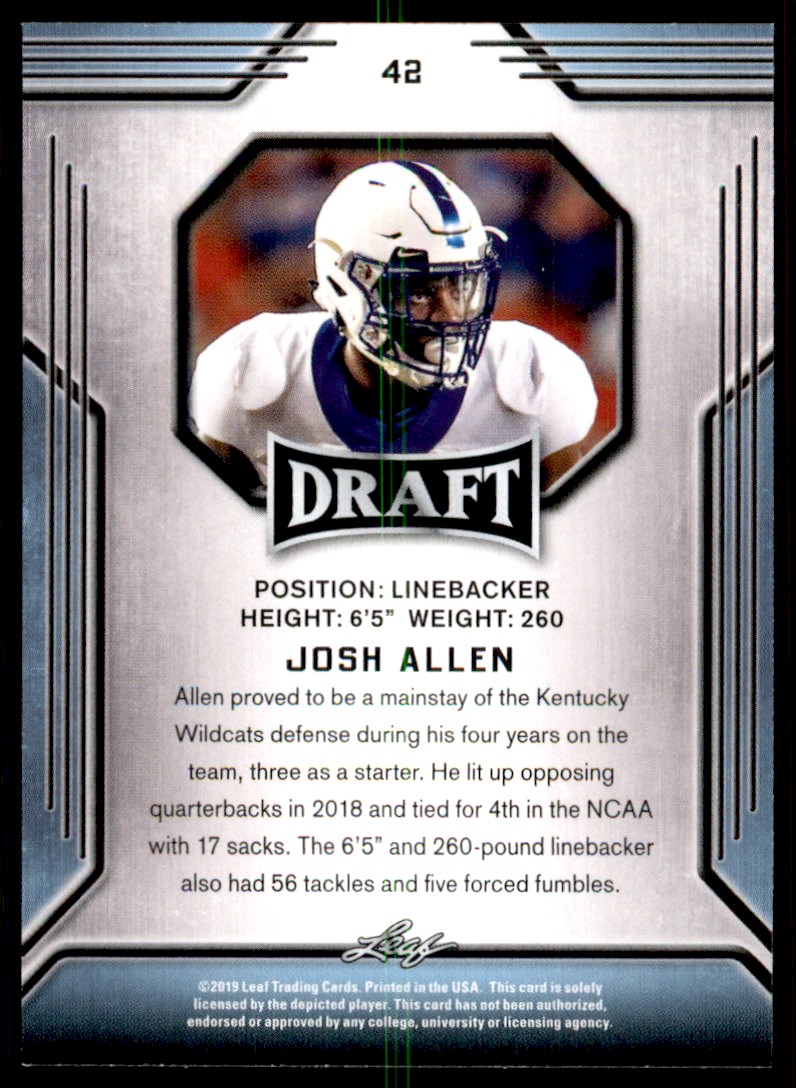 | Description: | Josh Allen | | Category: | Football | | Year: | 2019 | | Product: | Leaf Draft | | Team: | Kentucky Wildcats | | Card Number: | 42 | | Rookie: | Yes | | Dimensions: | 3½" x 2½" |