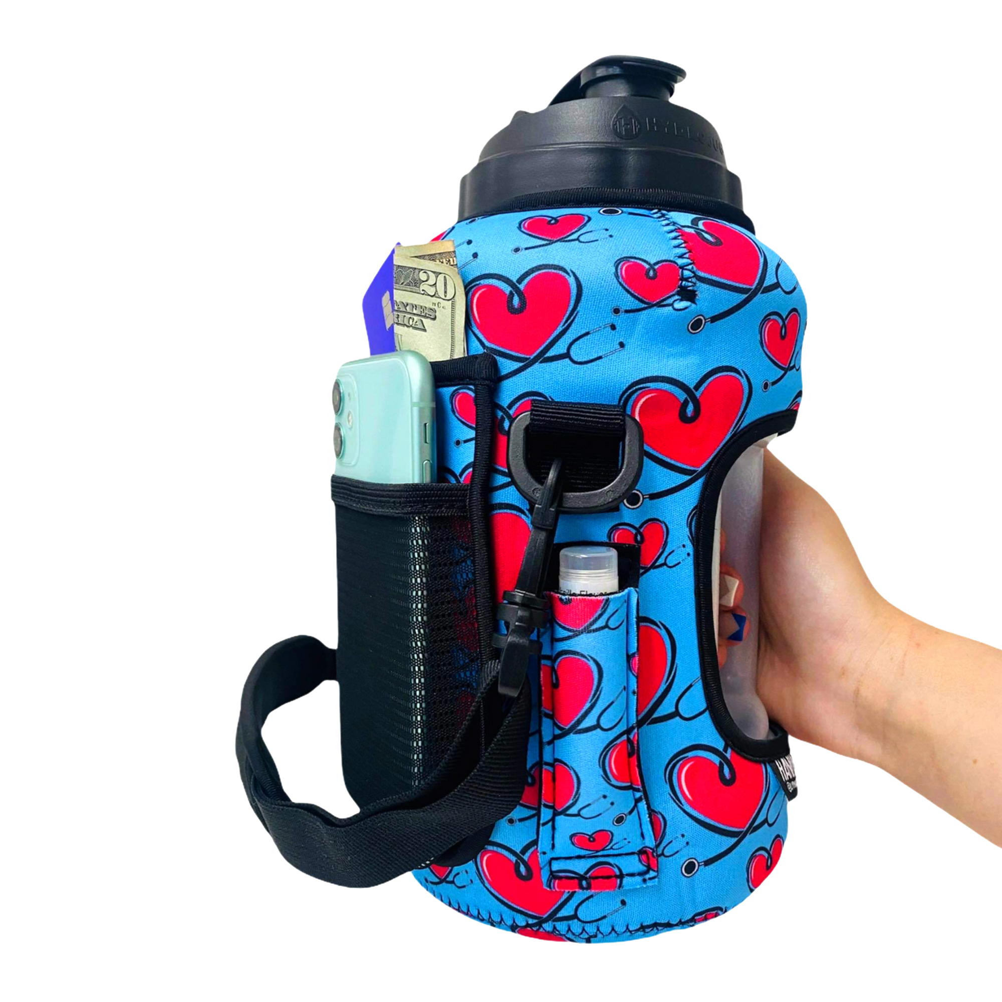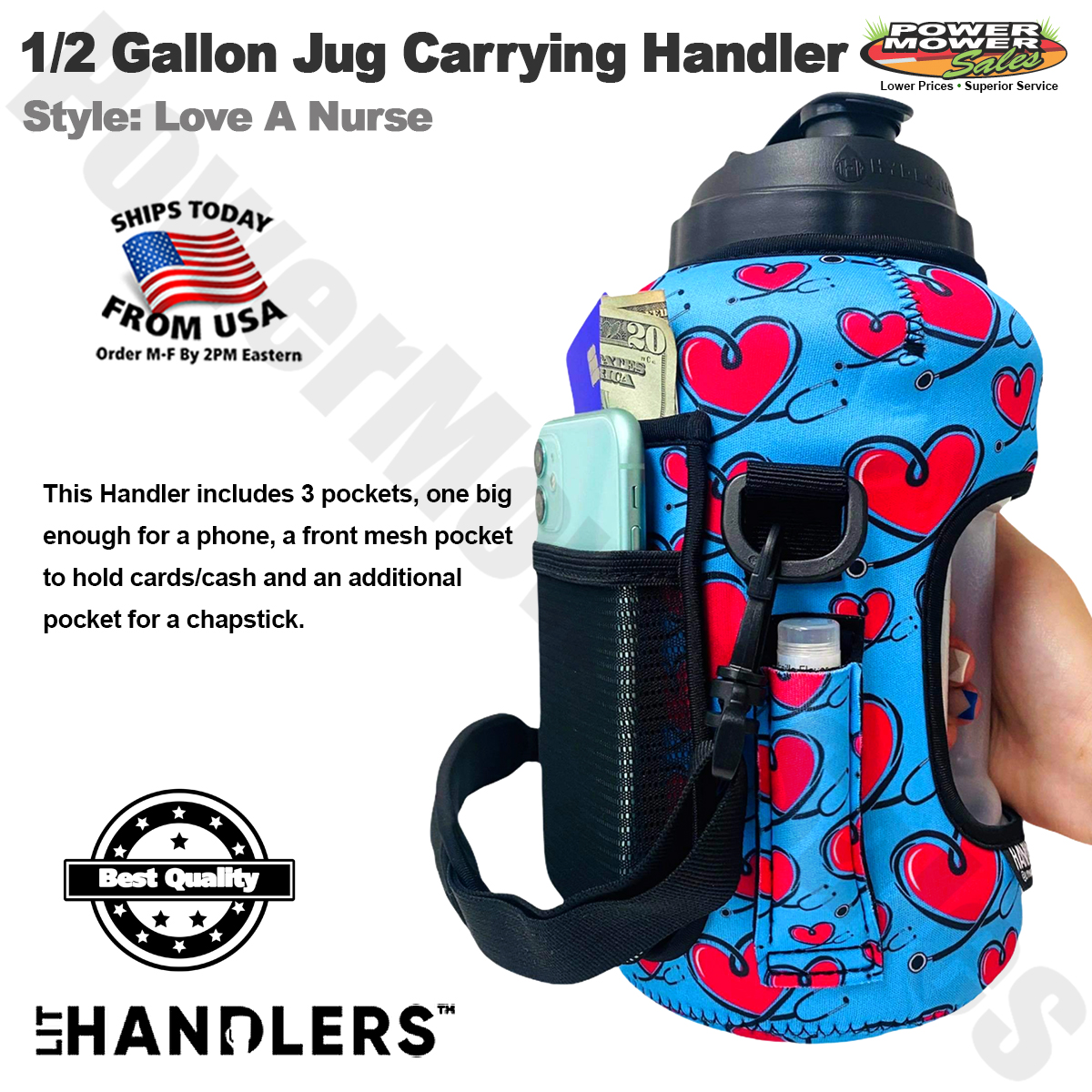 Lit Handlers 1/2 Gallon Jug - Love A Nurse Design - Neoprene Insulating Sleeve w/ Detachable Shoulder Strap, 3 pockets, including one mesh pocket for cards/cash & one for chapstick