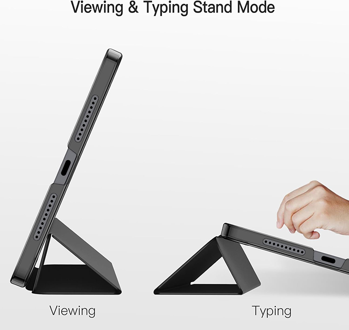 Vorderes Cover kann umgeklappt werden um die Schutzhülle zu einem Betrachtungs- und Tastatur-Aufsteller zu verwandeln.