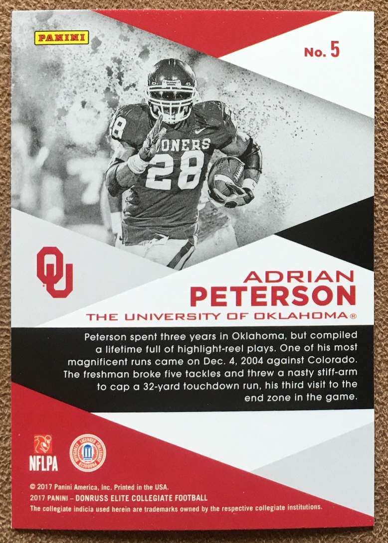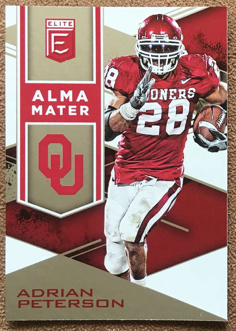 | Description: | Adrian Peterson | | Category: | Football | | Year: | 2017 | | Product: | Panini Elite Draft Picks Alma Mater | | Team: | Oklahoma Sooners | | Card Number: | 5 | | Dimensions: | 3½" x 2½" |