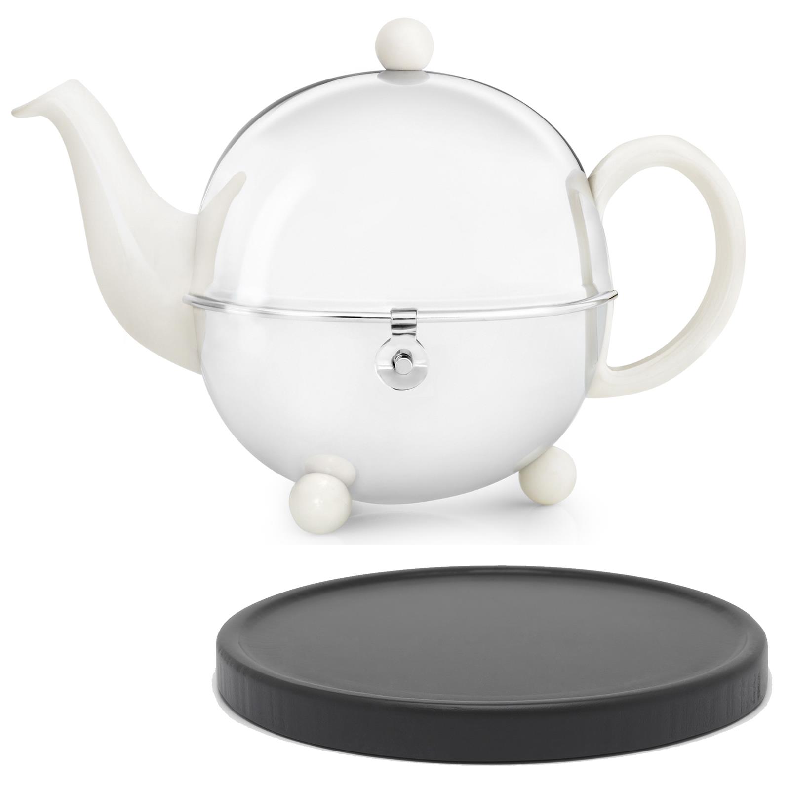 Der Vorteil dieser großen silber-creme-weißen Keramik-Teekanne mit schwarzem Holz Untersetzer im 2er Set ist seine warmhaltende Eigenschaft. Dank des glänzenden Edelstahlmantels mit isolierender Filz-Innenverkleidung der runden Teekanne mit 1.3 Liter Fassungsvermögen bleibt Ihr Tee, je nach Füllungsgrad, bis zu einer Stunde heiß und geschmackvoll. Die funktionelle weiße Steingutkanne für Tee sorgt für einen idealen Temperaturverlauf und hält auch danach Ihr Heißgetränk langanhaltend warm! Dank des komfortablen, keramischen Griffs der außergewöhnlichen, rundlichen Teekanne lässt sie sich auch befüllt gut handhaben. Die klappbare, 2-geteilte Edelstahl-Haube der bemerkenswerten Keramikteekanne mit Filter aus Edelstahl und einem Volumen von 900 ml lässt sich bequem abnehmen, die kugelige Keramikkanne ist spülmaschinengeeignet. Das langlebige Filter-Sieb erleichtert zudem Ihre Teezubereitung enorm. Das feinporige Dauer-Teesieb aus Edelstahl bietet neben der Nachhaltigkeit auch ein optimales Aroma des Tees: Ganze Teeblätter haben genug Platz, um ihren Geschmack voll entfalten zu können und klein gemahlene Teeblätter bleiben in dem feingliedrigen Teesieb dieser großen Steingutteekanne. Die praktische 1300 ml Steingut-Edelstahl-Teekanne verfügt drei stabile Kunststoff-Füße und steht somit sicher und standfest auf Ihrem Tisch. Dazu bezaubert das glanzvolle Design der großen Edelstahl-Teekanne aus weißem Keramik jeden Teeliebhaber.