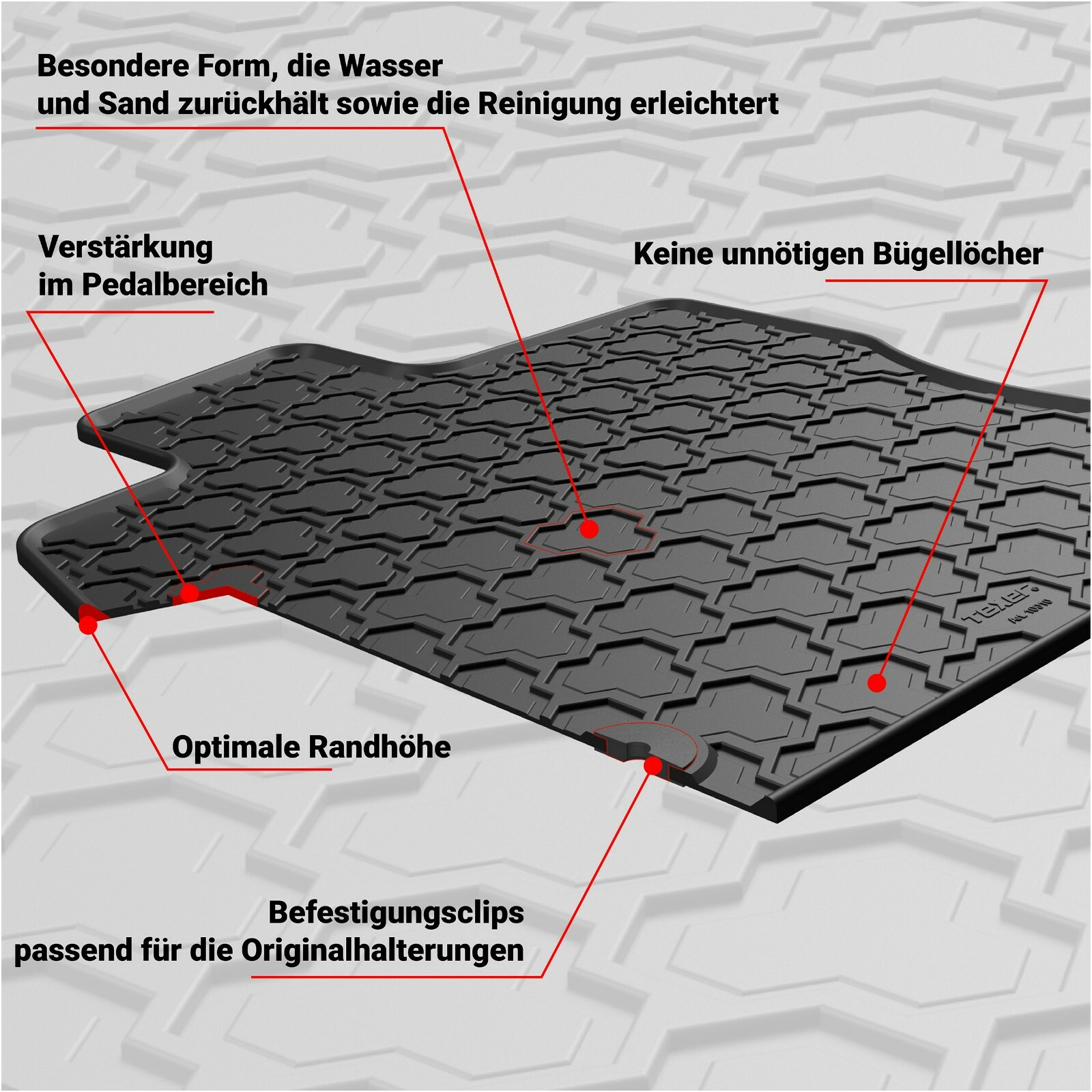 Wir empfehlen Ihnen TEXER Gummimatten. Die Fußmatten wurden in der EU, aus hochwertigen Material hergestellt.
