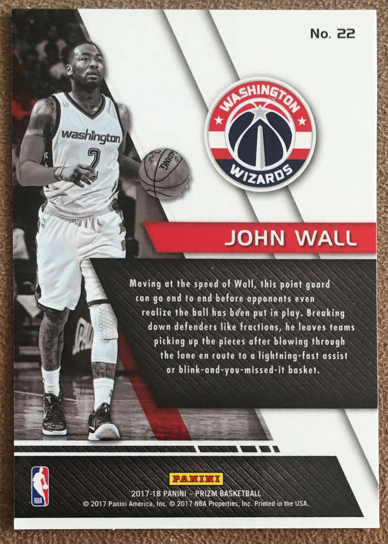| Description: | John Wall | | Category: | Basketball | | Year: | 2017 | | Product: | Panini Prizm Fundamentals | | Team: | Washington Wizards | | Card Number: | 22 | | Dimensions: | 3½" x 2½" |