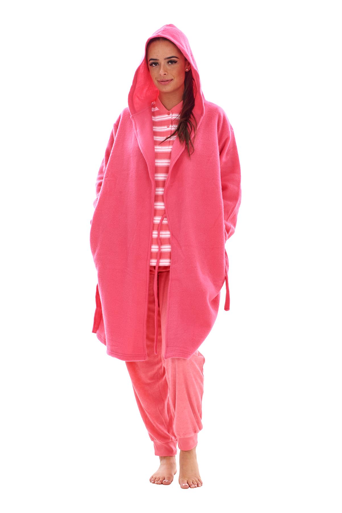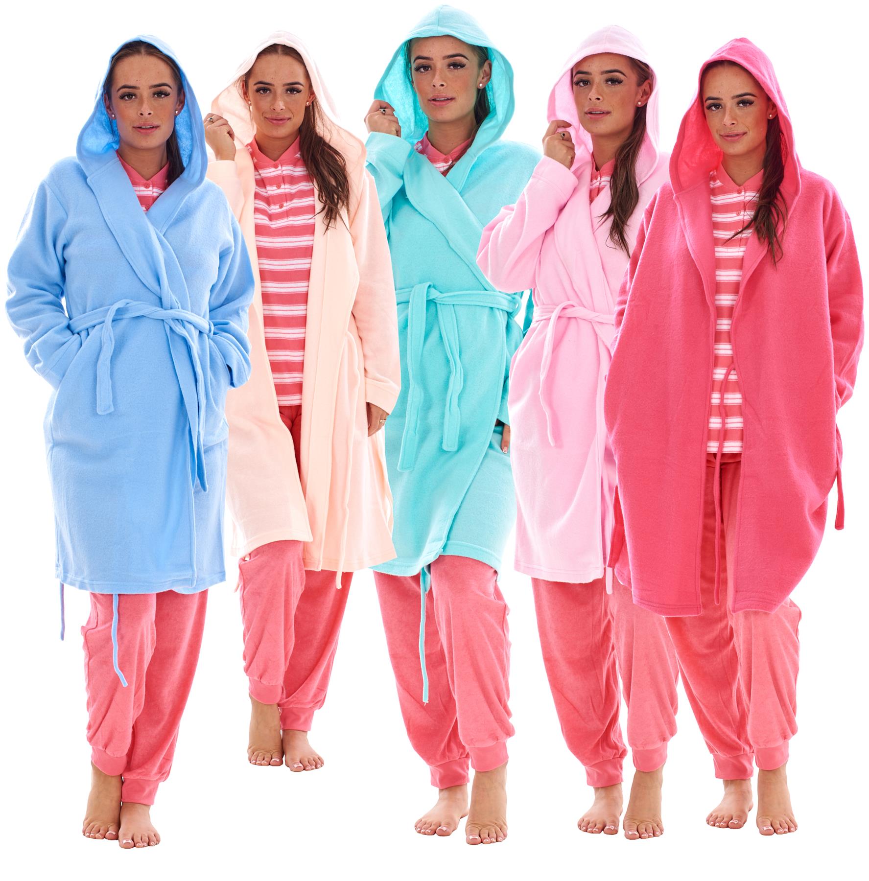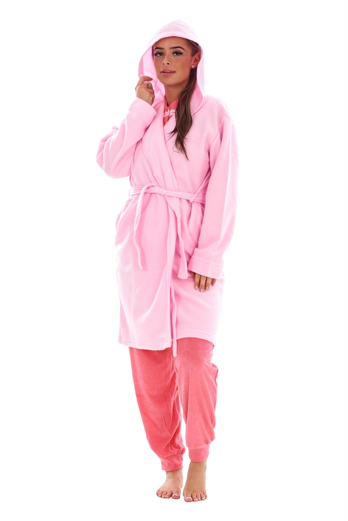 - Stay cosy and comfortable with this ladies fleece hooded dressing gown. Perfect for lounging at home, keeping warm on chilly evenings, or layering over nightwear.