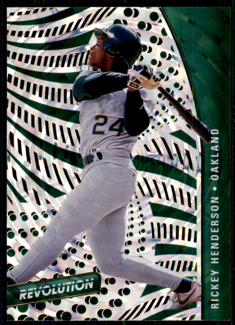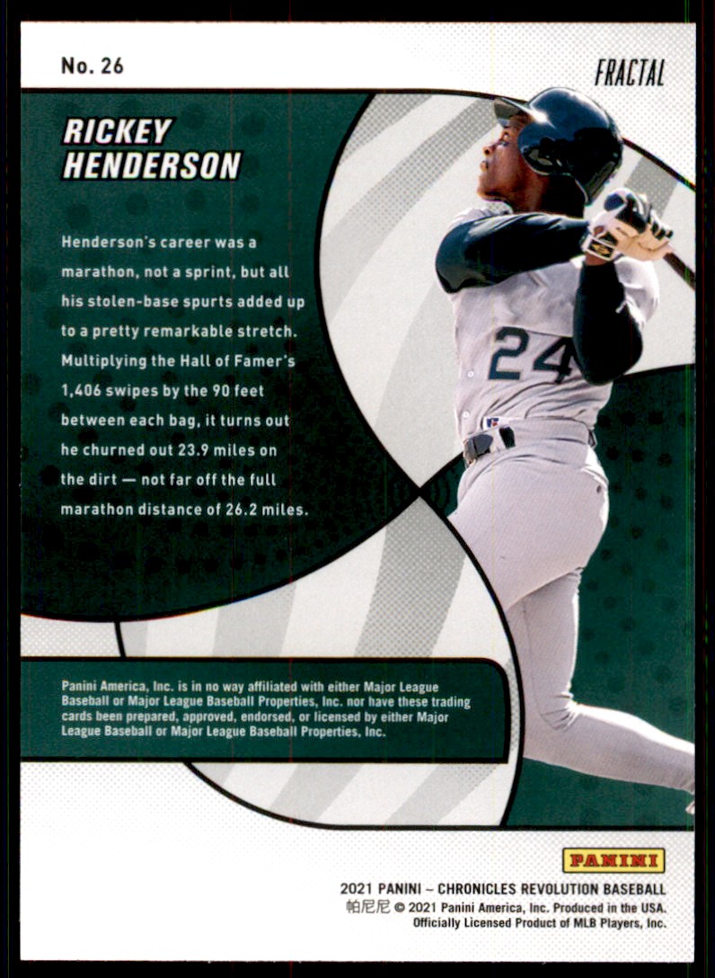 | Description: | Rickey Henderson | | Category: | Baseball | | Year: | 2021 | | Product: | Panini Chronicles | | Set: | Revolution Fractal | | Team: | Oakland Athletics | | Card Number: | 26 | | Dimensions: | 3½" x 2½" |