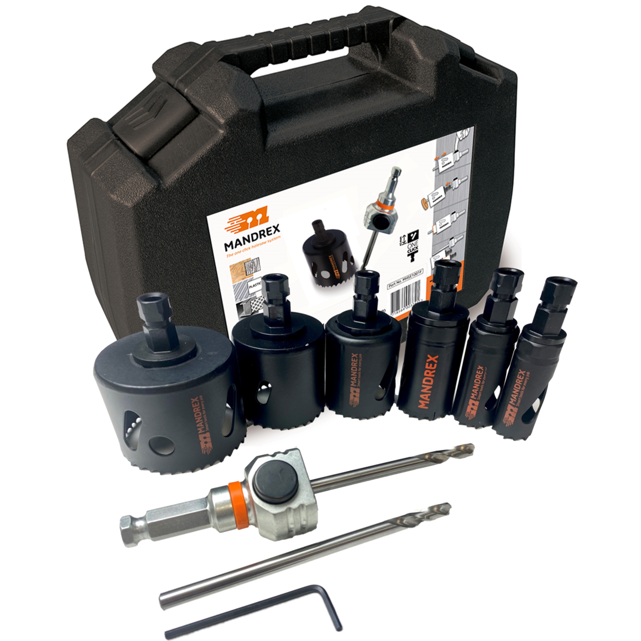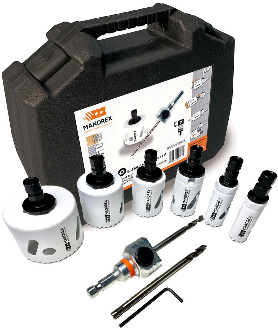 6 Mandrex SuperXcut Lochsägen im Koffer; Durchmessern: 19 | 25 | 30 | 35 | 40 | 68 mm; Mandrex One Klick 8,5 mm Aufnahme + 2 Zentrierbohrer & Inbusschlüssel.