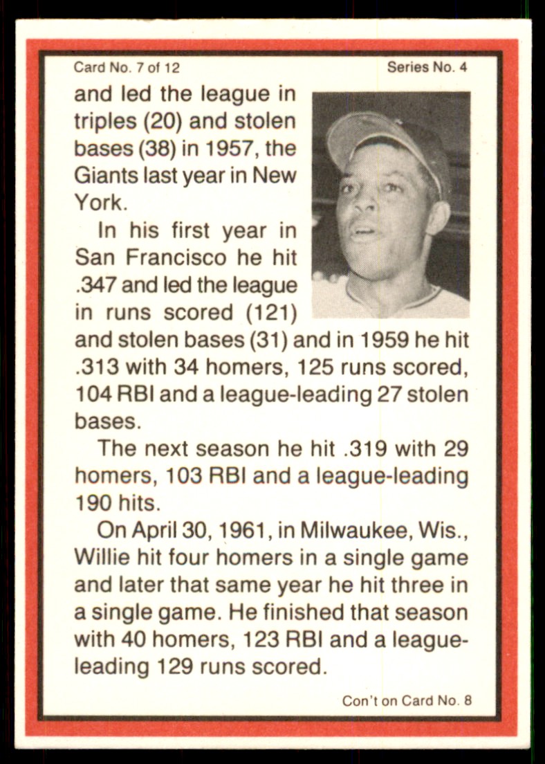 | Description: | Willie Mays | | Category: | Baseball | | Year: | 1983 | | Product: | ASA Promo Mays Story | | Team: | San Francisco Giants | | Card Number: | 7 | | Dimensions: | 3½" x 2½" |