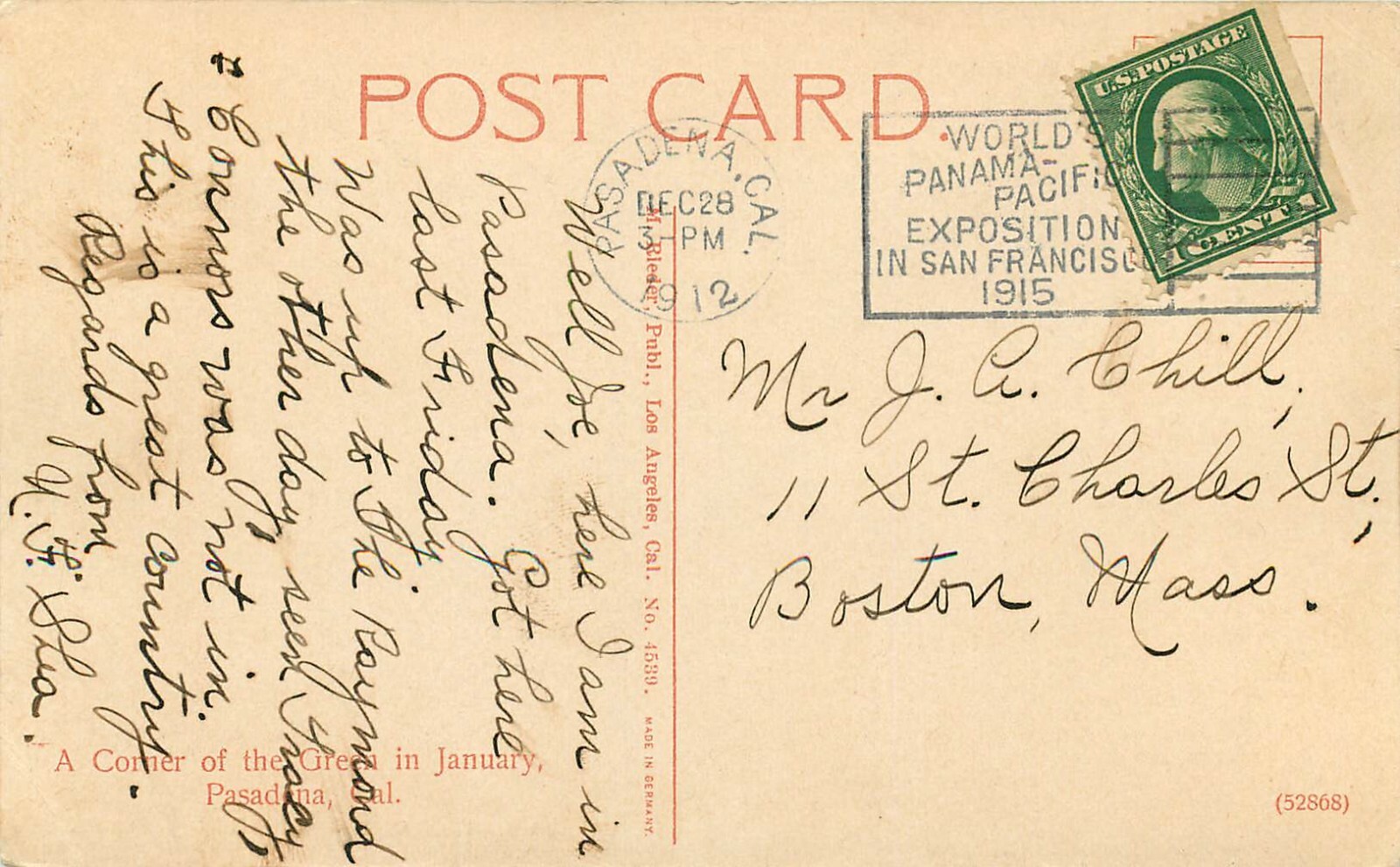 DB Postcard CA D546 Pasadena January Garden Residential 1912 Rieder Germany