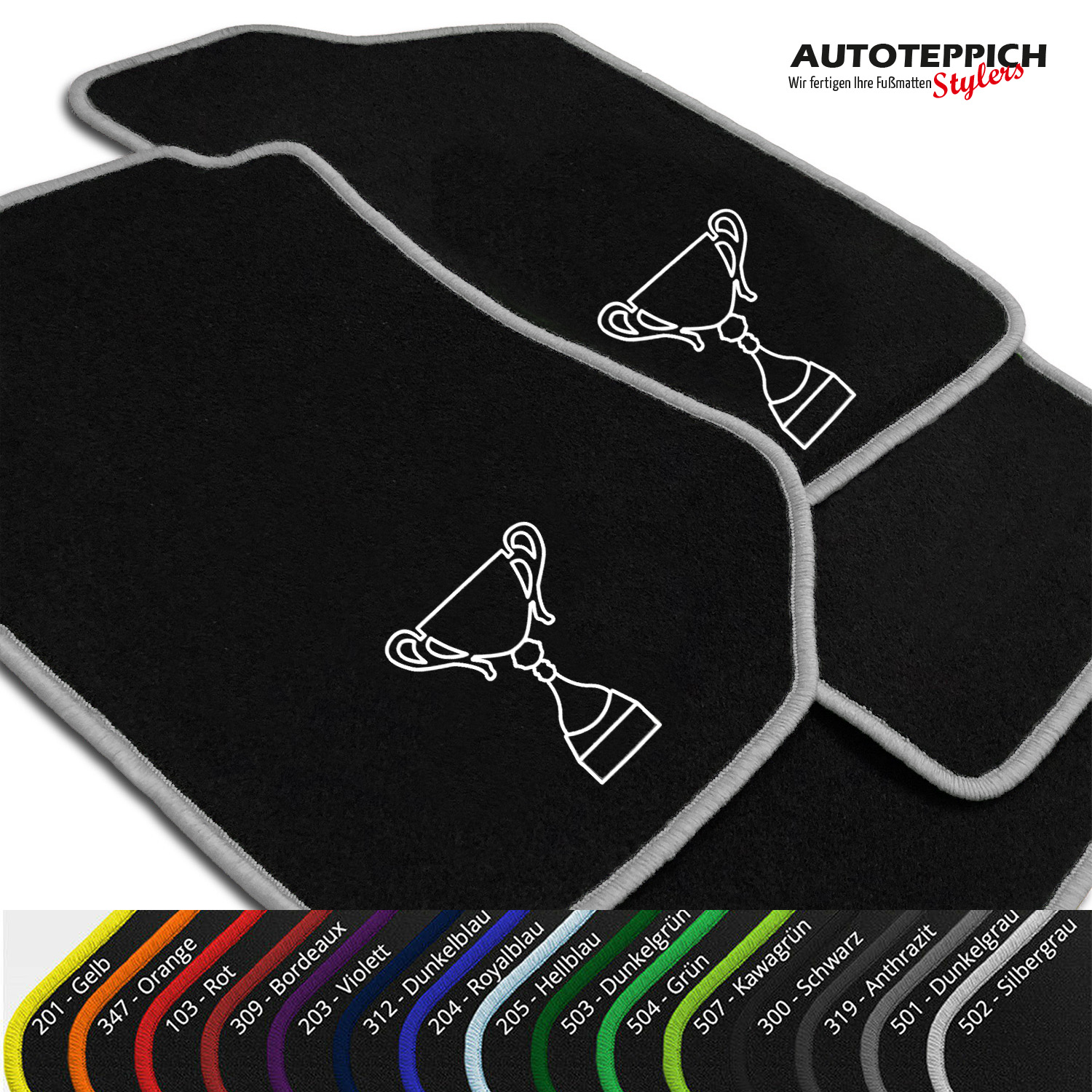 Die Fußmatten werden für Sie passgenau in Wächtersbach/Hessen gefertigt und mit unserem Versandpartner DHL zu Ihnen versendet. Es handelt sich hierbei nicht um Lagerware - alles wird für Sie unter Berücksichtigung Ihrer Farbwünsche für Sie gefertigt!