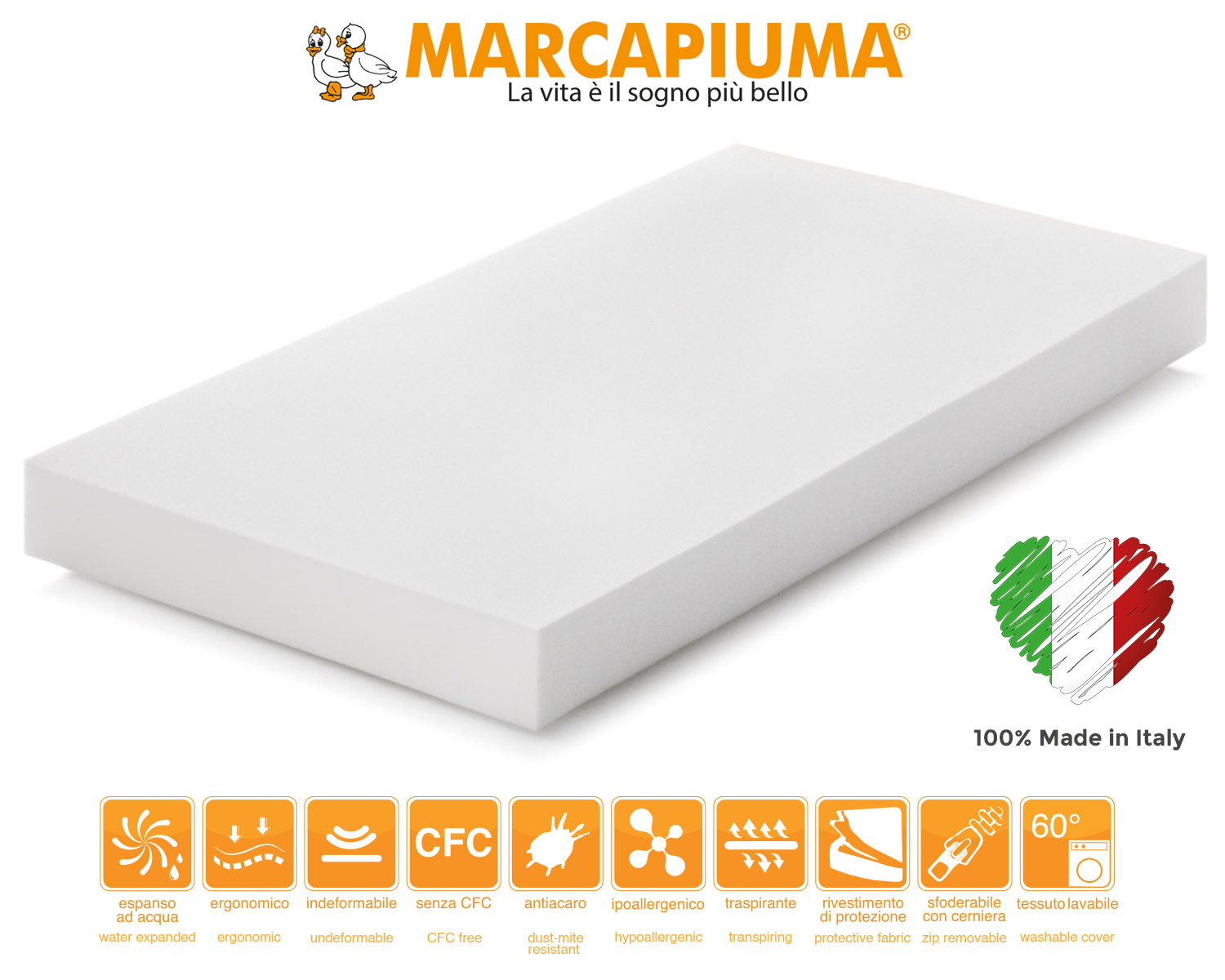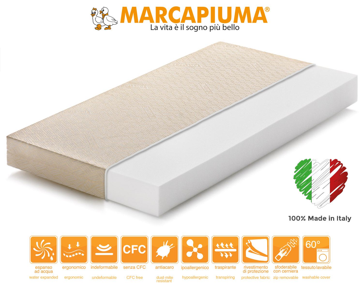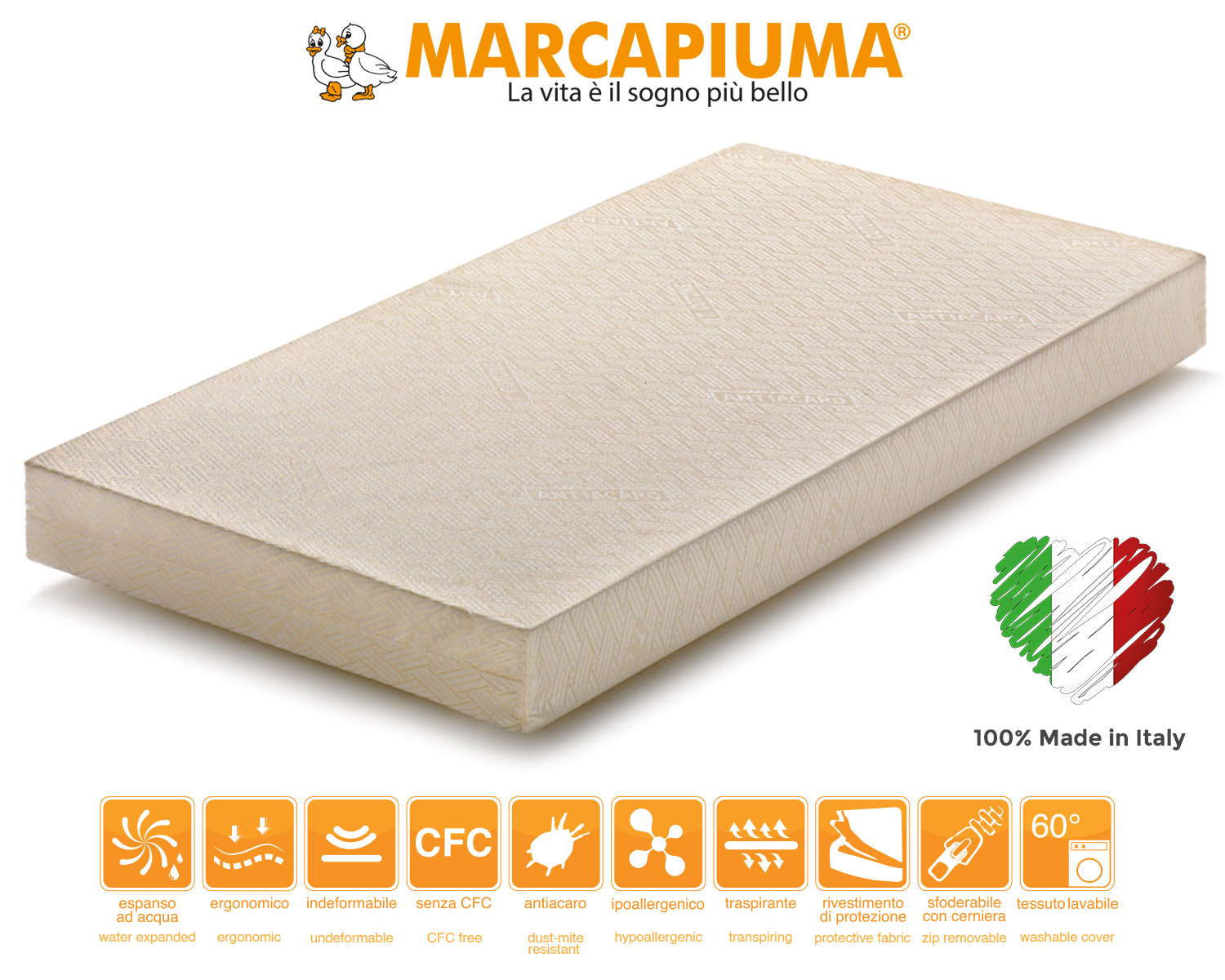 Materasso per bambino composto da Waterfoam alto 10 cm, schiuma espansa ad acqua ad alta resilienza con struttura a celle aperte ultra traspirante.