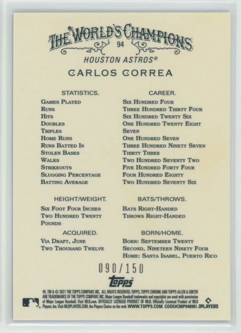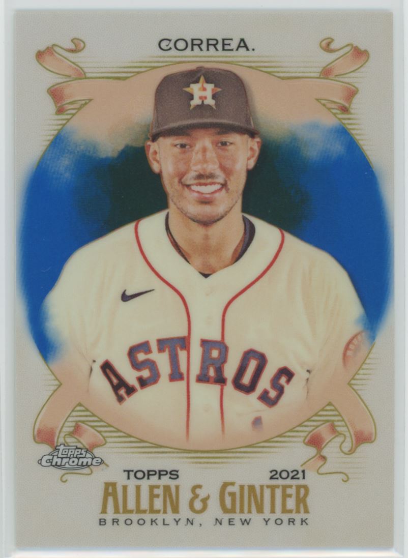 | 2021 Topps Allen & Ginter Chrome Blue Refractor 090/150 94 Carlos Correa |
